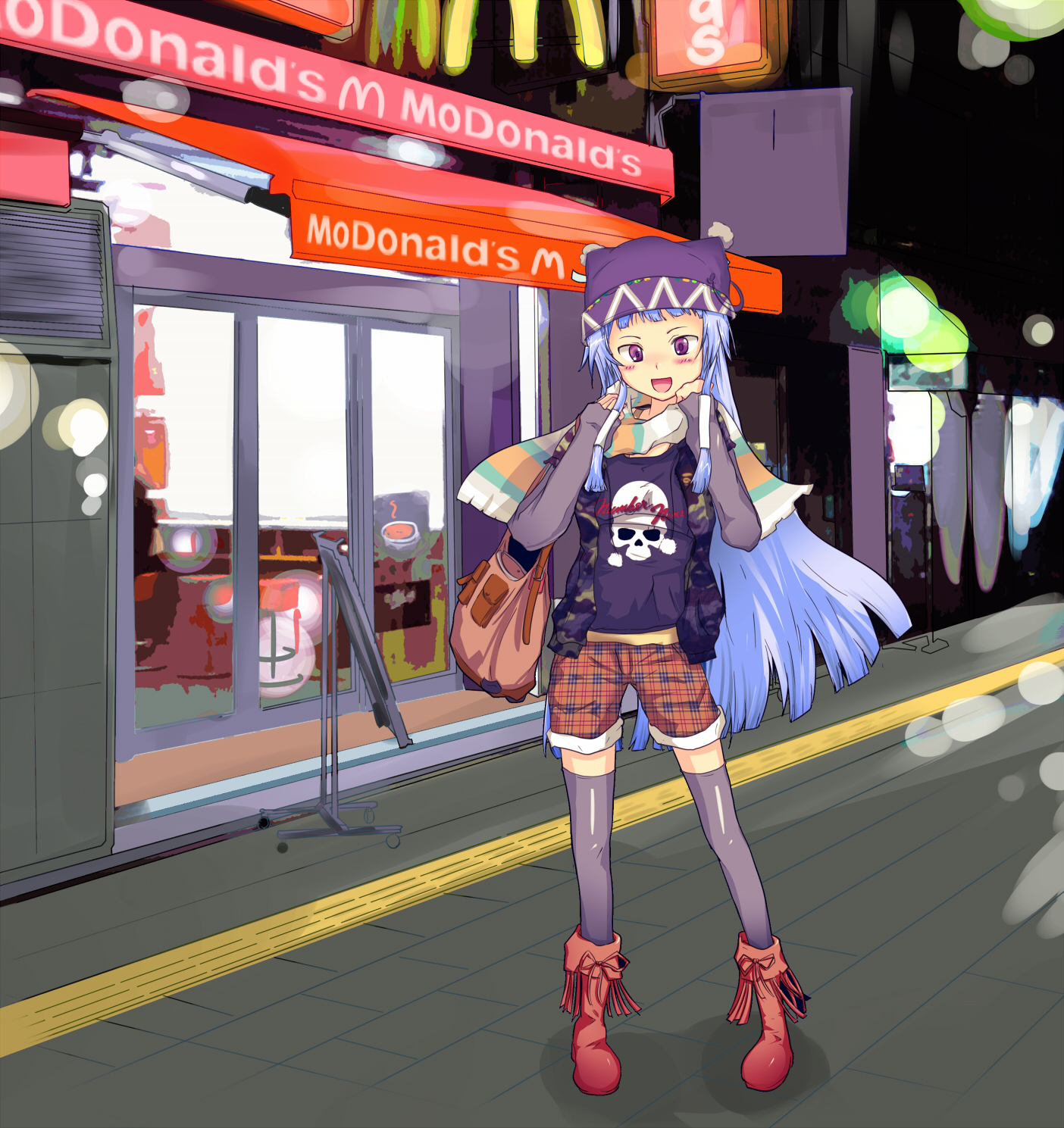 00s1girlbagbeanieblue hairblunt bangscasualfemale focushair tubeshandbaghatlong hairpurple eyesscarfshortssolothighhighs