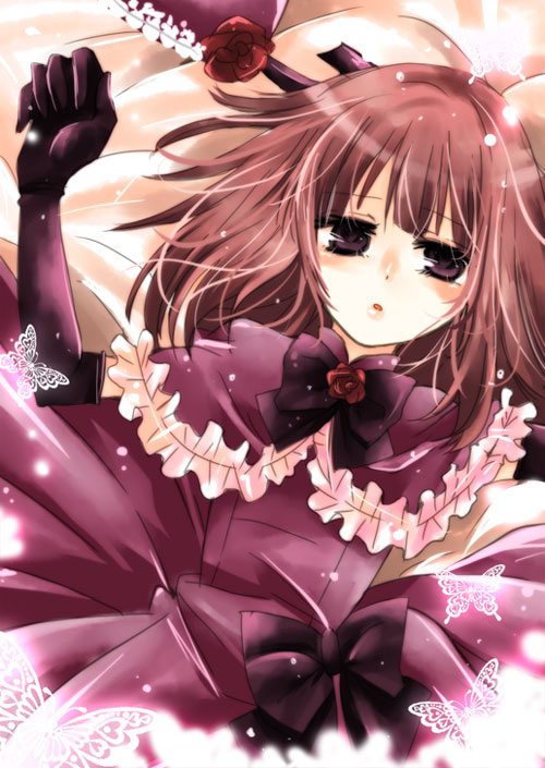 00s1girlblunt bangsbowbrown eyesbrown hairbugbutterflydressfemale focusflowerfrillsgloveshatinsectlolita fashionlong hairlooking at viewerlyingon backopen mouthparted lipspurple dresspurple eyesred hairrosesolo