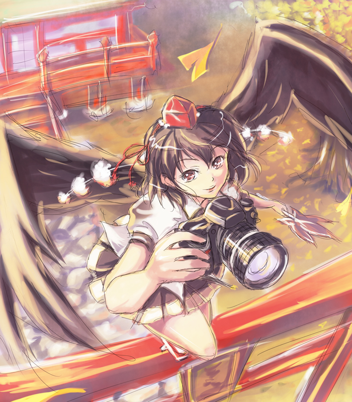 1girlblack hairblack wingsbrown eyescamerafemale focusgetahand fanhatlooking at vieweropen mouthshrinesolotengu-getatokin hattoriiwings