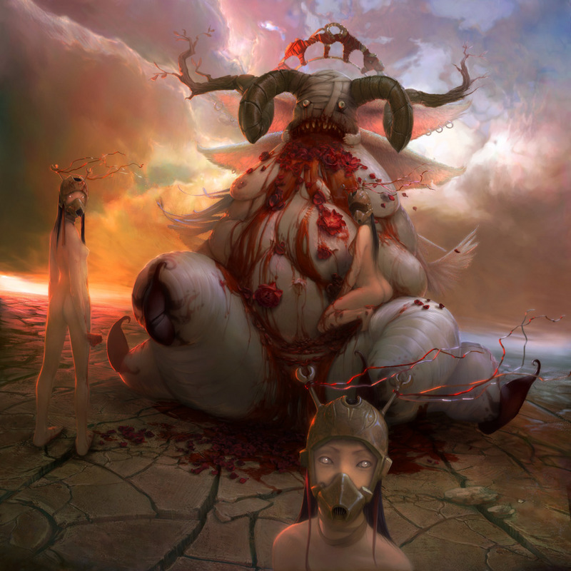 3girlsbandagesbloodcloudcreepyearringsflowergas maskgurohelmethornshorror (theme)jewelrylooking at viewermaskmind controlmonstermultiple girlsnudepetalsrespiratorroseskysurrealwhatwhite eyeswings