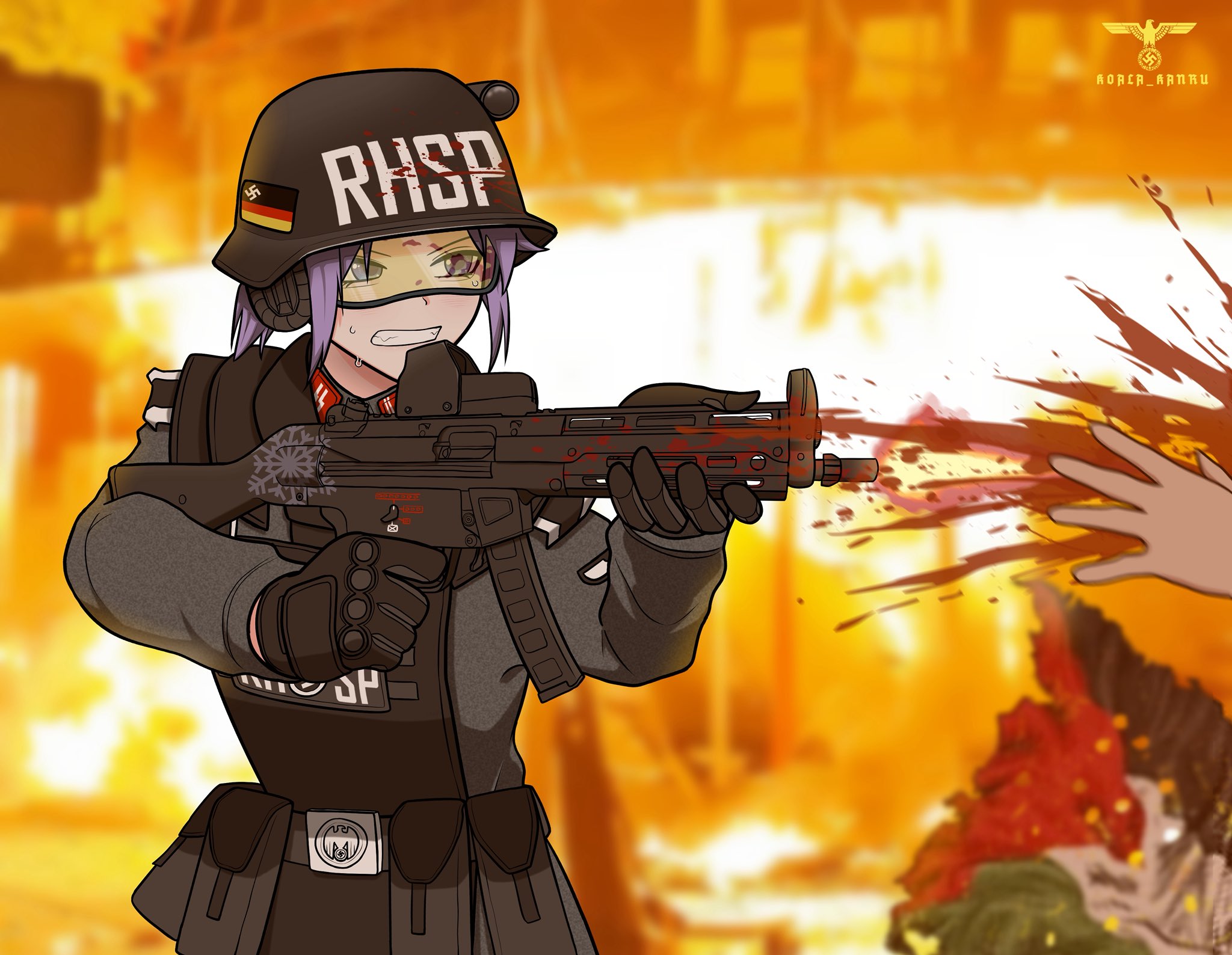 1girlammunition pouchartist nameassault riflebelt buckleblack glovesbloodbucklefiregerman flagglovesgogglesgunheadscarfhelmetholdingholding gunholding weaponimplied deathmilitary uniformpalestinian flagpouchpurple eyespurple hairreichsadlerrifleshort hairsoloss insigniaswastikasweatdropwaffen-ssweapon