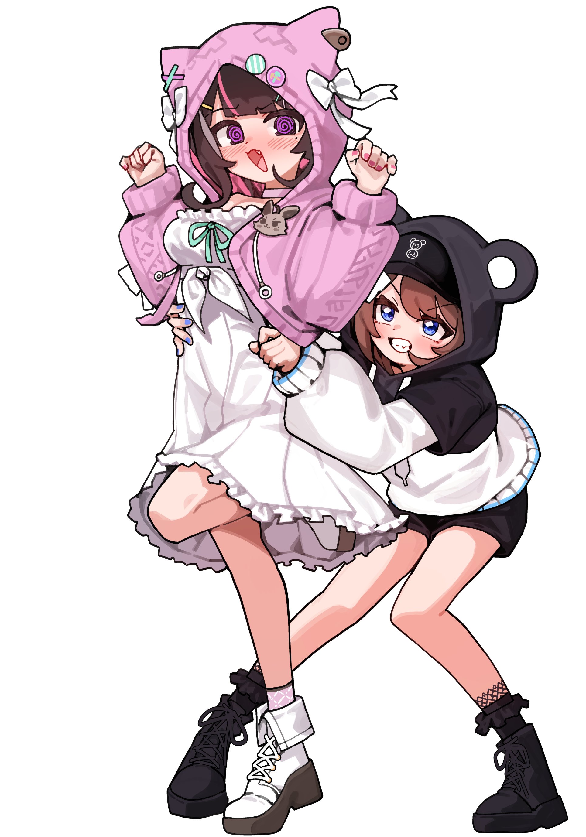0th generation (hololive)2girlsbrown hairchokercolored inner hairdressmulticolored hairmultiple girlspurple eyesshort dressvirtual youtuberwhite backgroundwhite dress
