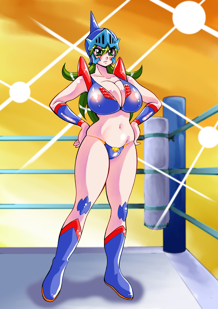 1girlangrybikiniblue bikiniblue bootsblue helmetblushbootsbreastscleavagecollarbonecovered erect nipplesgreen eyesgreen hairhands on own hipshelmethuge breastsknee padslong hairlooking at viewernavelsparklestandingswimsuitwrestlerwrestling ringwristband