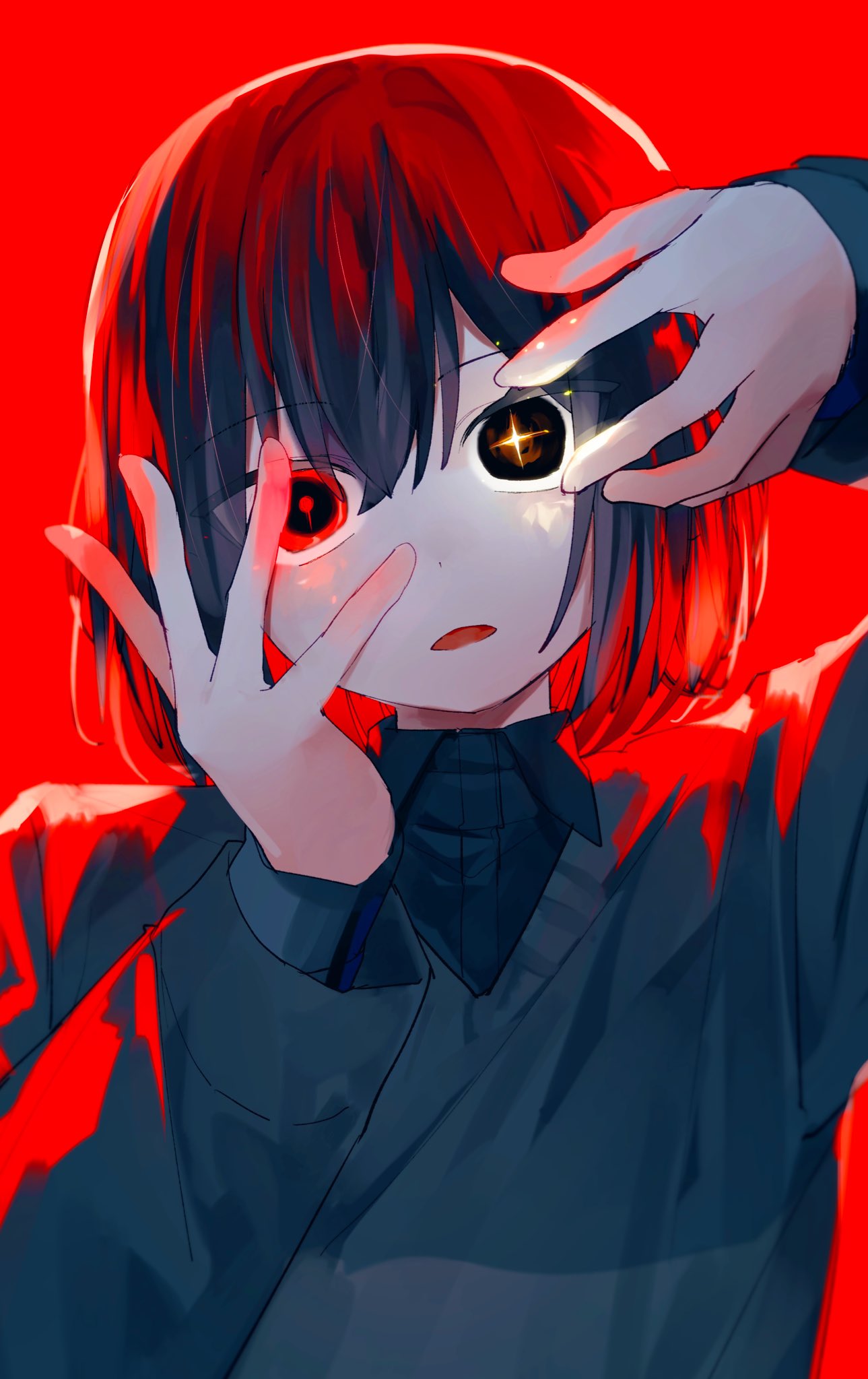 1boy1otherarm upbacklightingblack eyesblack shirtbob cutbright pupilsbrown haircollared shirtdouble-parted bangsfrownglowingglowing eyesgreen sweaterhair between eyeshair intakeshand uphead tiltlayered sleeveslong sleeveslooking at viewermismatched pupilsmulticolored eyesopen mouthother focuspuffy long sleevespuffy sleevesred backgroundred eyesred pupilsshirtshort hairsimple backgroundsolostraight-onsweatertwo-tone eyestwo-tone sweaterupper bodyyellow pupilsyellow sweater