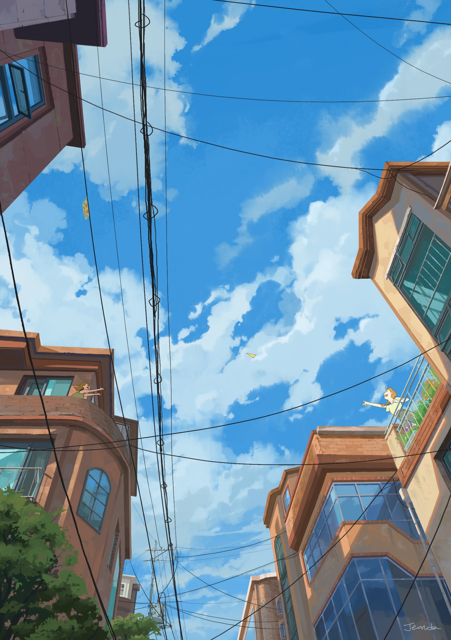 1girl1otherapartmentblue skybuildingcablecloudcloudy skydayfrom abovepower linessceneryskytea soteartreewindow