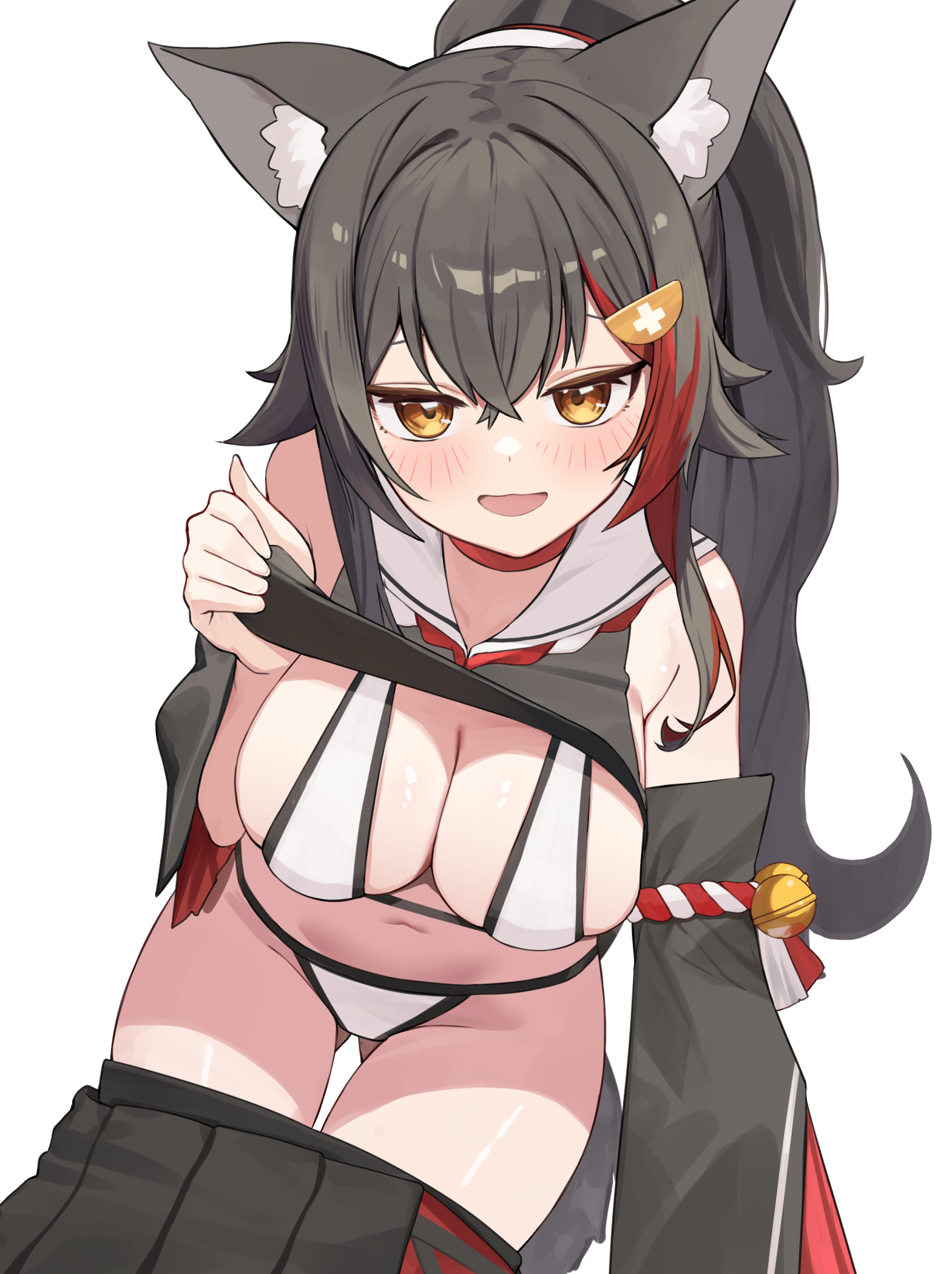 1girlanimal earsblack hairblack shirtblack sleevesbreastsclothes liftdetached sleevesgluteal foldlarge breastslifting own clotheslooking at vieweropen mouthred hairshirtshirt liftsolovirtual youtuberwolf earswolf girlyellow eyes