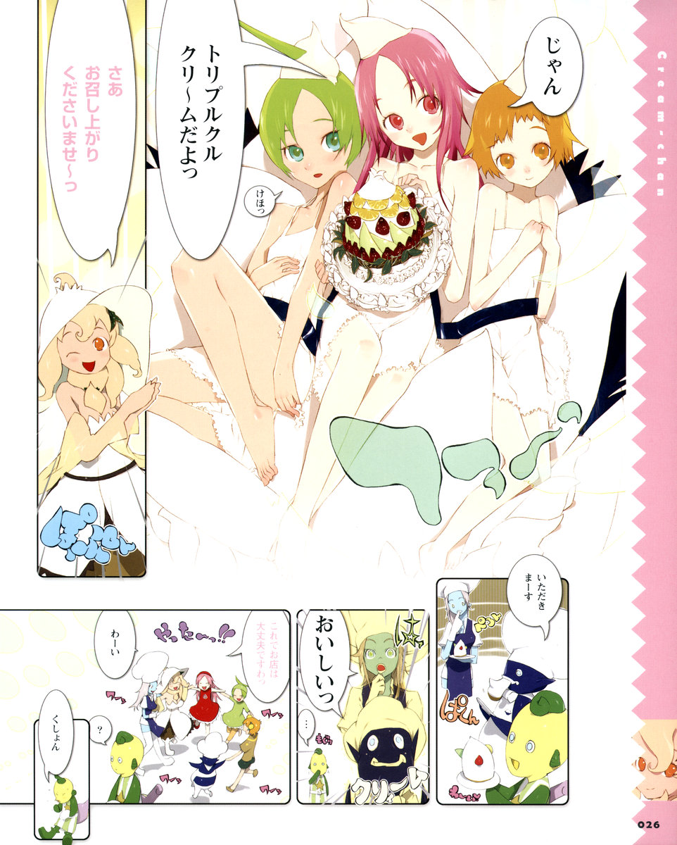 5girlsbarefootcakechefchef hatcomiccreamdressfoodhatmultiple girlsone eye closedpastrywhite themewink