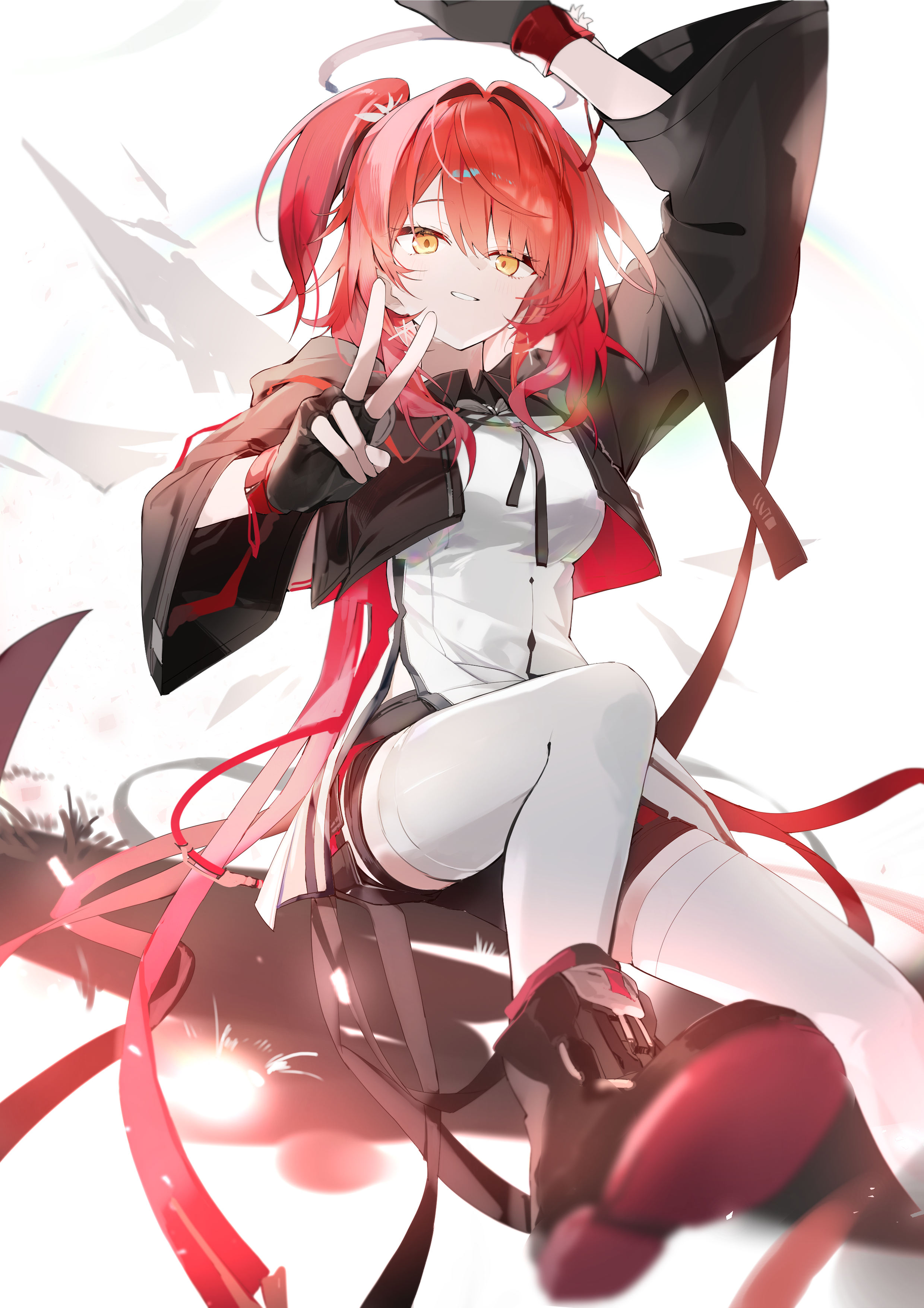 1girlankle bootsarm upblack bootsblack glovesbootsfingerless glovesglovesgrey halogrinhalolight particleslooking at viewermedium hairone side upred hairshoe solessittingsmilesolothighhighstraditional halovwhite backgroundwhite thighhighsyellow eyes