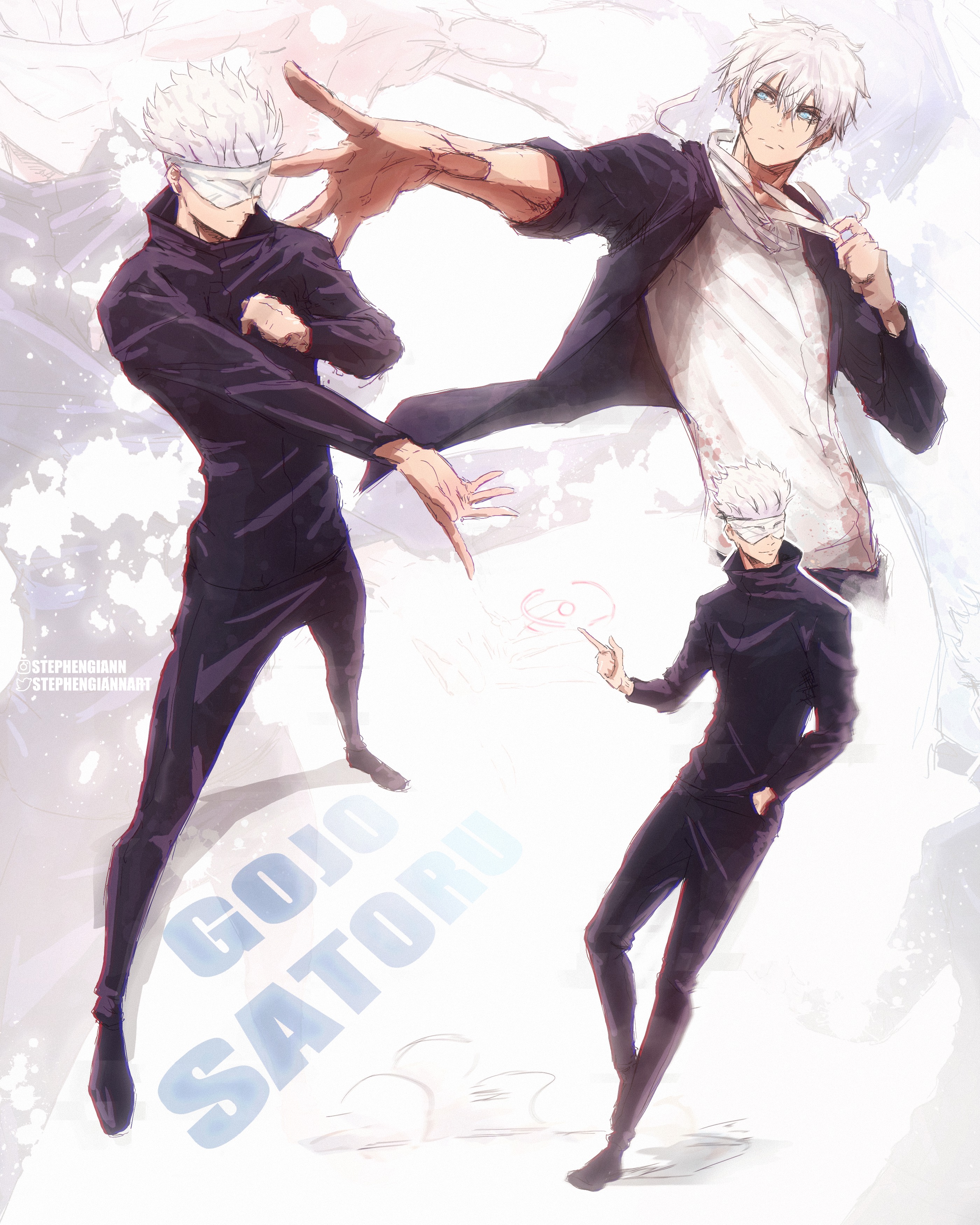 1boyblindfoldblue eyescharacter nameclosed mouthfull bodyhair between eyeshair upinstagram logoinstagram usernamejujutsu tech uniformmale focusmultiple viewsoutstretched armshirtshort hairsolotwitter logotwitter usernamewhite hairwhite shirt