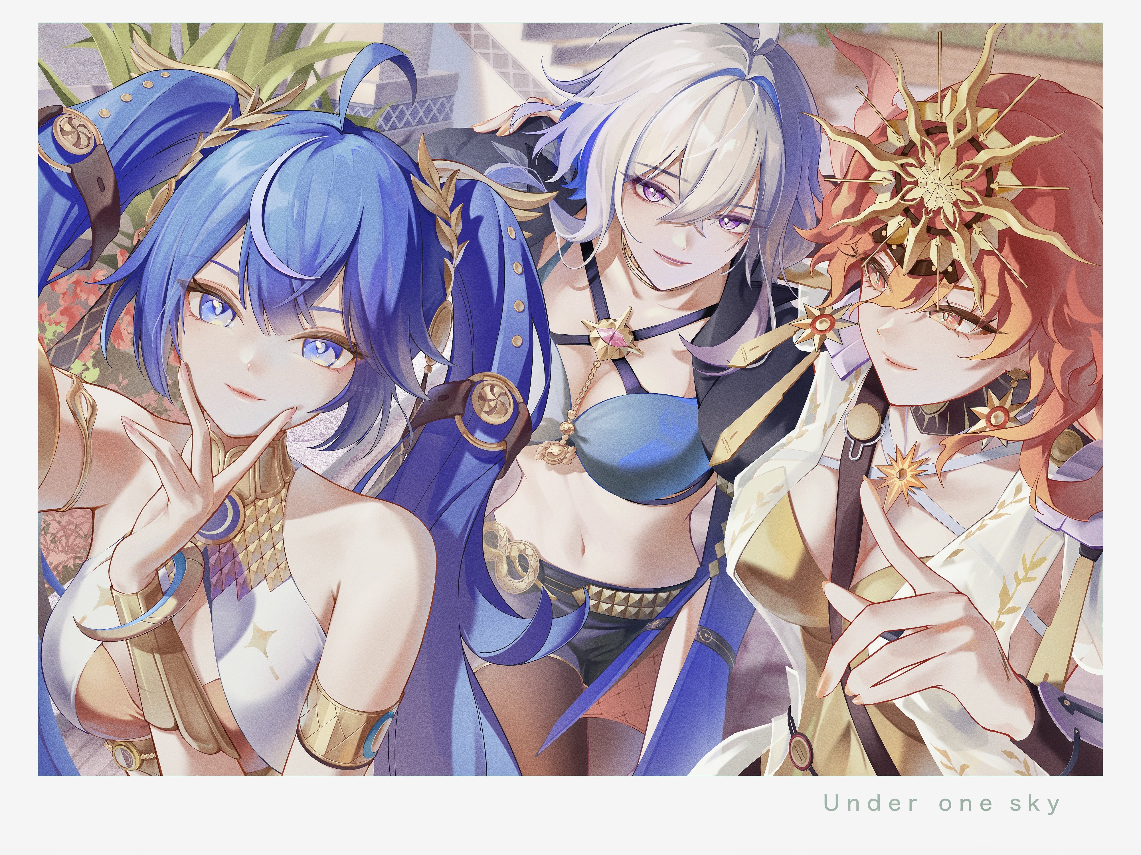 3girlsahogearmletarmorbare shouldersblack pantyhoseblack shortsblue brablue eyesblue hairbrabreastplatebreastsclosed mouthenglish textgold bragrey hairhair between eyeshair intakeshand upheadgearjewelrylaurel crownlooking at viewermedium breastsmedium hairmulticolored hairmultiple girlsnavelorange hairpantyhosepurple eyesred eyesshortssmilestomachstreaked hairtacet mark (wuthering waves)twintailsunderwearv