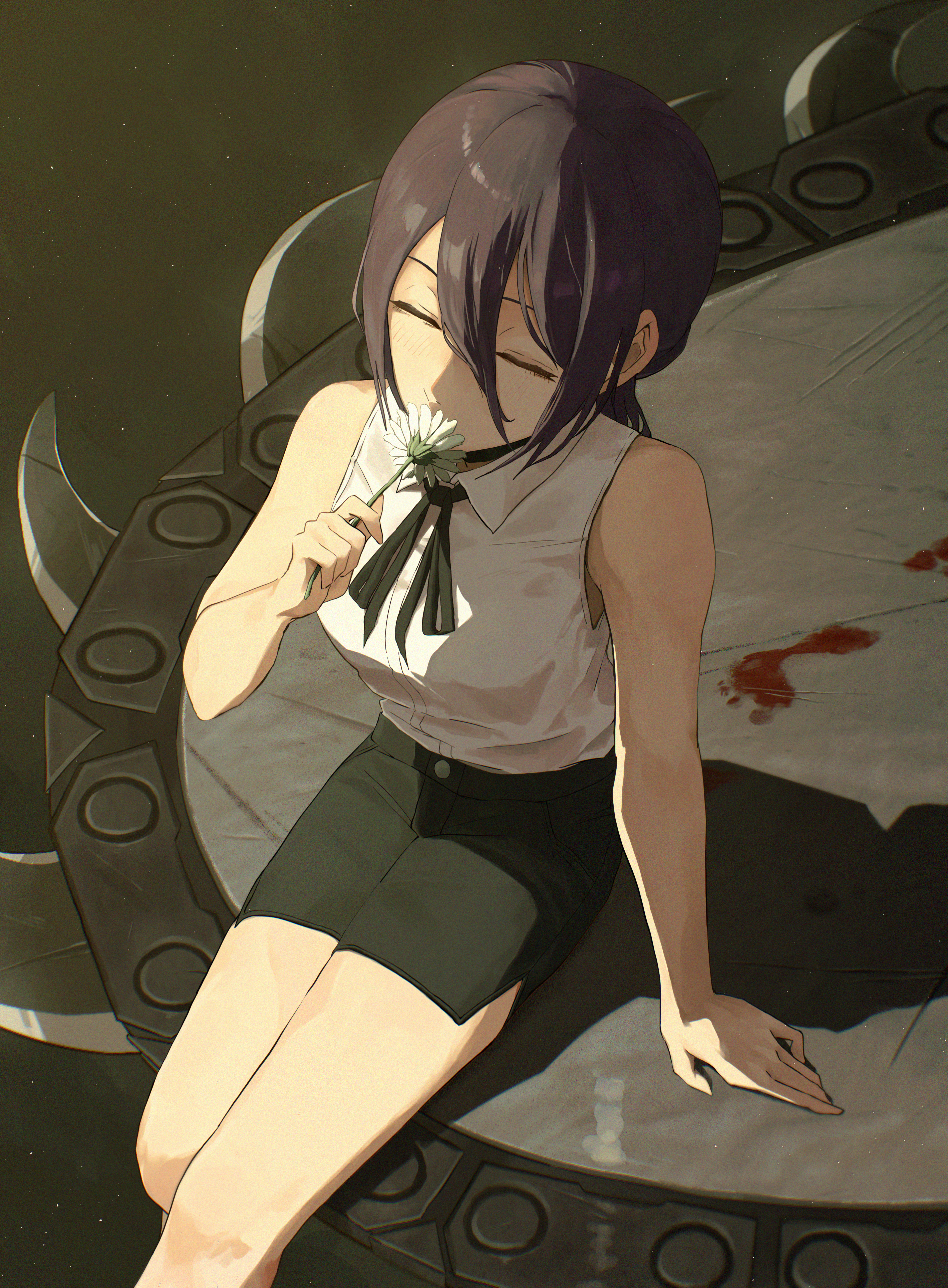 1girlarm supportbare armsbare legsblack chokerblack hairblack ribbonblack shortsbloody footprintschainsawchokerclosed eyesfeet out of frameflowergerberahair between eyesholdingholding flowerlong hair between eyesneck ribbonribbonshirtshortssittingsleevelesssleeveless shirtsolowhite flowerwhite shirt