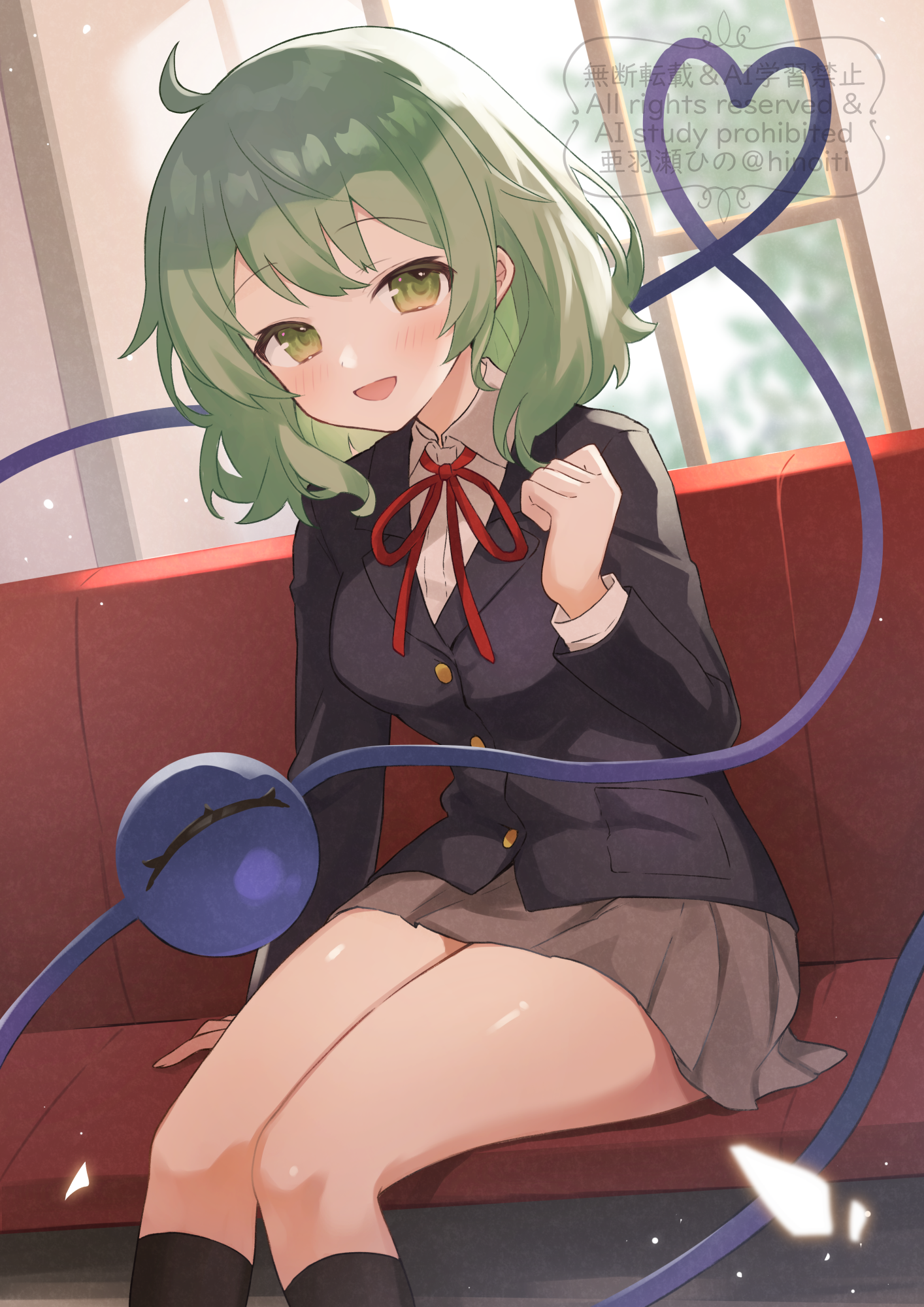 1girlahogealternate costumeblack jacketblack socksblazerblushbrown skirtfeet out of framegreen eyesgreen hairheartheart of stringjacketlong sleeveslooking at viewerminiskirtneck ribbonpleated skirtred ribbonribbonschool uniformshirtskirtsmilesockssolothird eyewatermarkwhite shirt