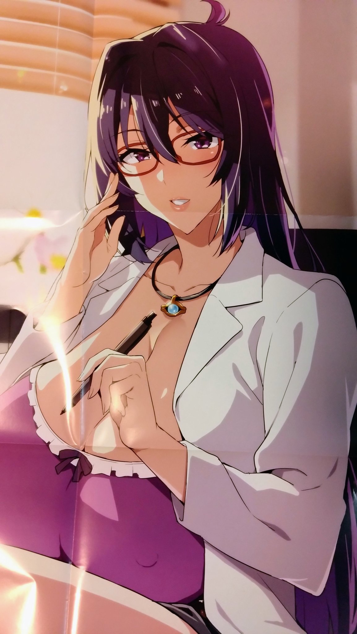 1girladjusting eyewearblue hairblushbreastscleavagecovered erect nipplesglasseshair between eyesholdingholding penhuge breastsindoorsjewelrylab coatlong hairlooking at viewernecklaceparted lipspenpurple eyessittingsmilesolo