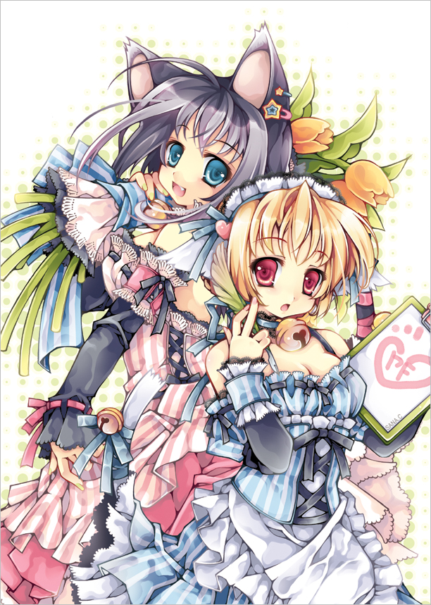 2girlsanimal earsbellblack hairblonde hairblue eyesblushbouquetbowbreastscat earscollarcorsetdresselbow glovesfangflowerfrillsgloveshair ornamenthairclipmedium breastsmultiple girlsneck bellred eyesribbonshort hairtulipwaitress