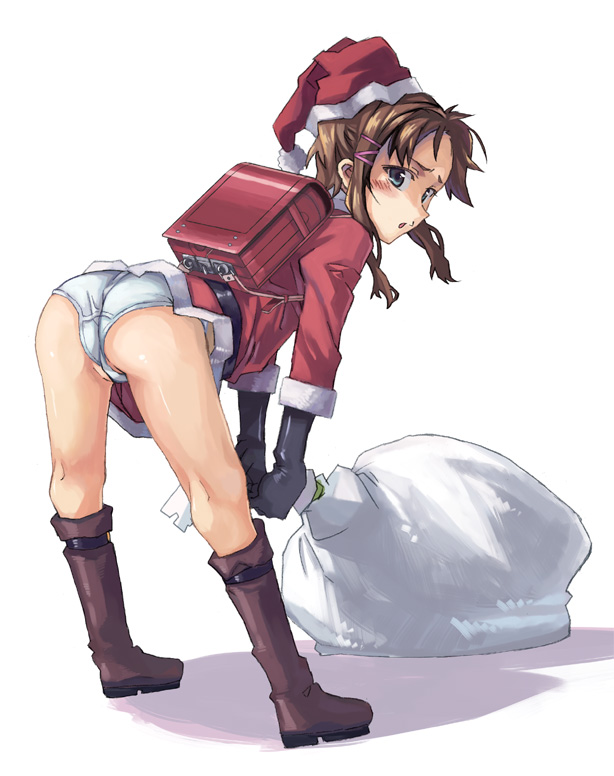 1girlassbackpackbagbent overblushbootsbottomlessbrown hairfemale focushatlegslooking backno pantspantiesrandoserusacksanta costumesanta hatsolounderwearwhite panties