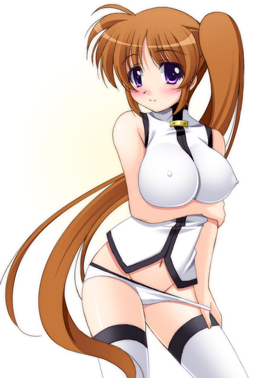 00s1girlbare shouldersblushbreastsbrown haircovered erect nipplesfemale focuslarge breastslong hairpantiesponytailpurple eyessolothighhighsunderwear