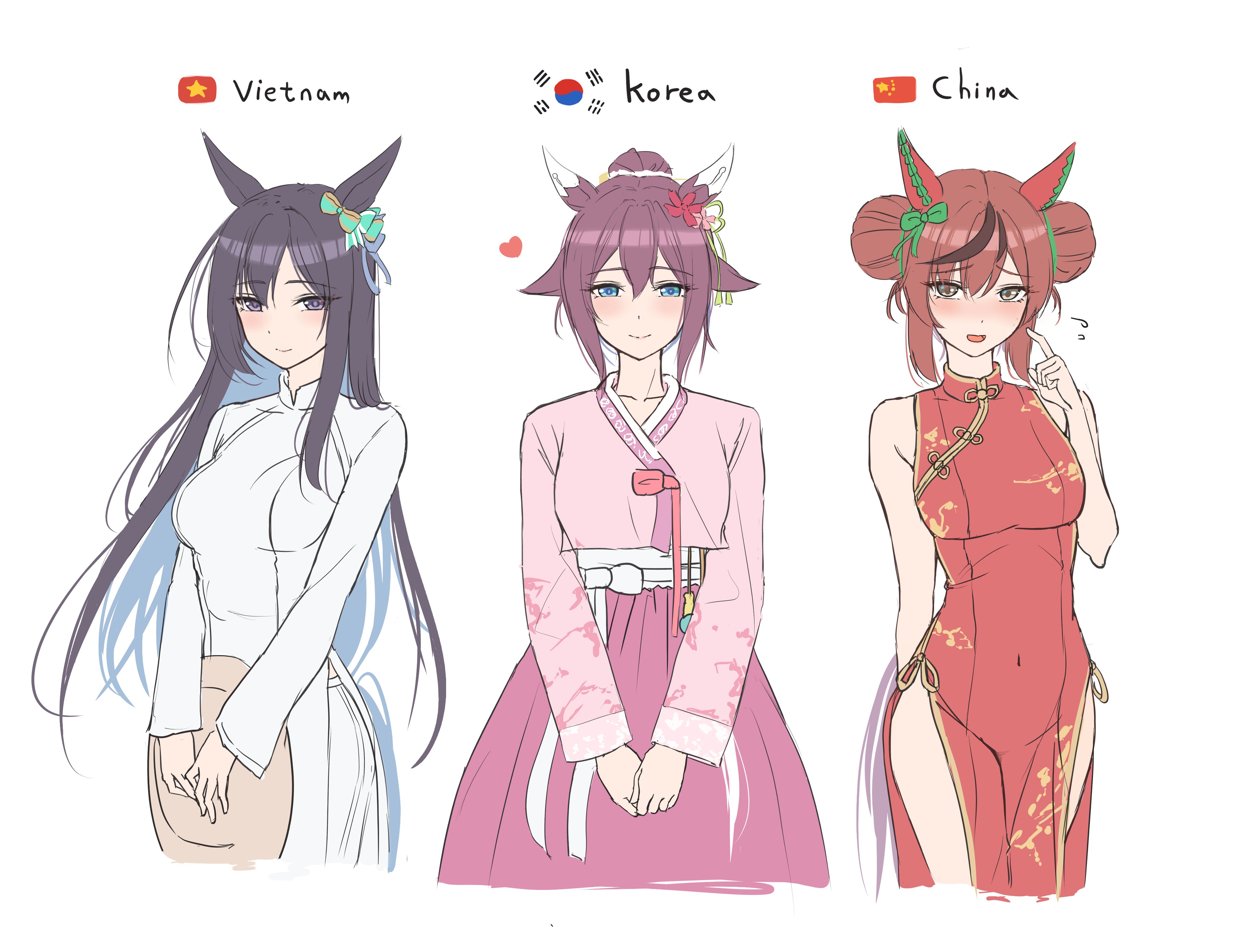 3girlsalternate costumeanimal earsao daibare armsblack hairbrown haircheck costumechima (clothes)china dresschinese clothescovered naveldressear coversear ornamentflagflying sweatdropshair flapshanbokhatholdingholding unworn clothesholding unworn hathorse earshorse girlhorse tailindex finger raisedkorean clotheslong sleevesmultiple girlspantspelvic curtainpink hanbokpink shirtpink skirtred dressshirtskirtsleevelesssleeveless dresstailunworn hatunworn headwearvietnamese clotheswhite dresswhite pantswhite streaks