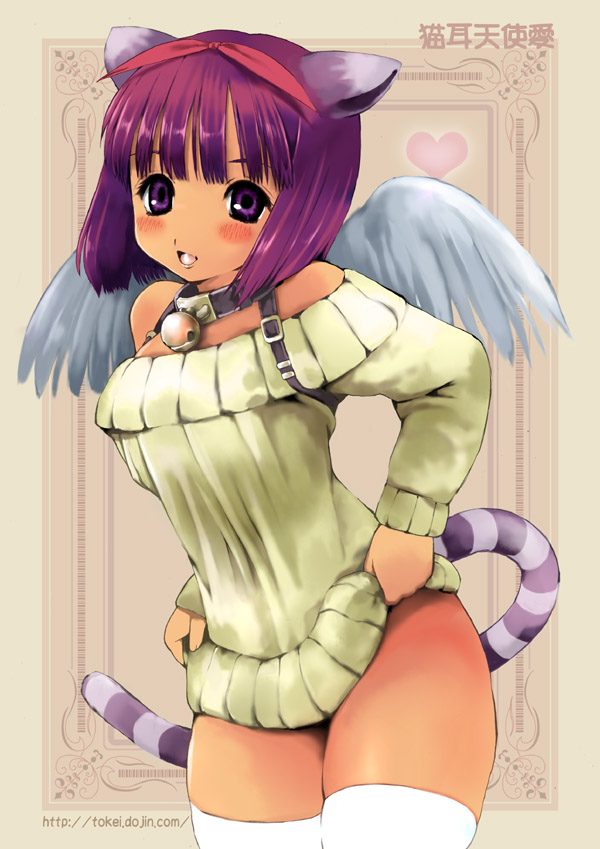 1girlanimal earsbellblushbowcat earscat tailcollarfemale focushair bowneck bellno pantspurple eyespurple hairshort hairsmilesolosweatertailthighhighswhite thighhighswings