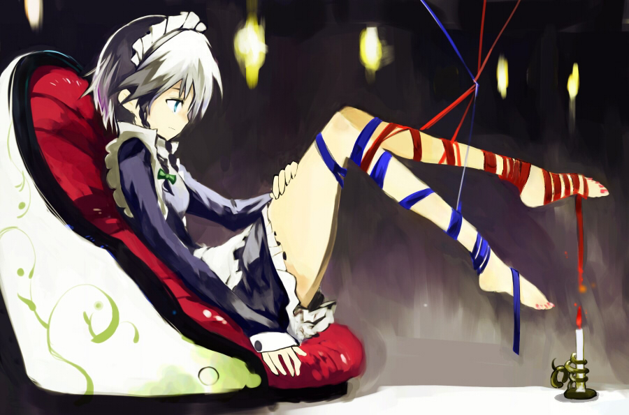1girlbarefootblue eyescandlefeetfemale focushairbandleg ribbonlegslegs upmaidmaid headdressprofileribbonshort hairsittingsolo