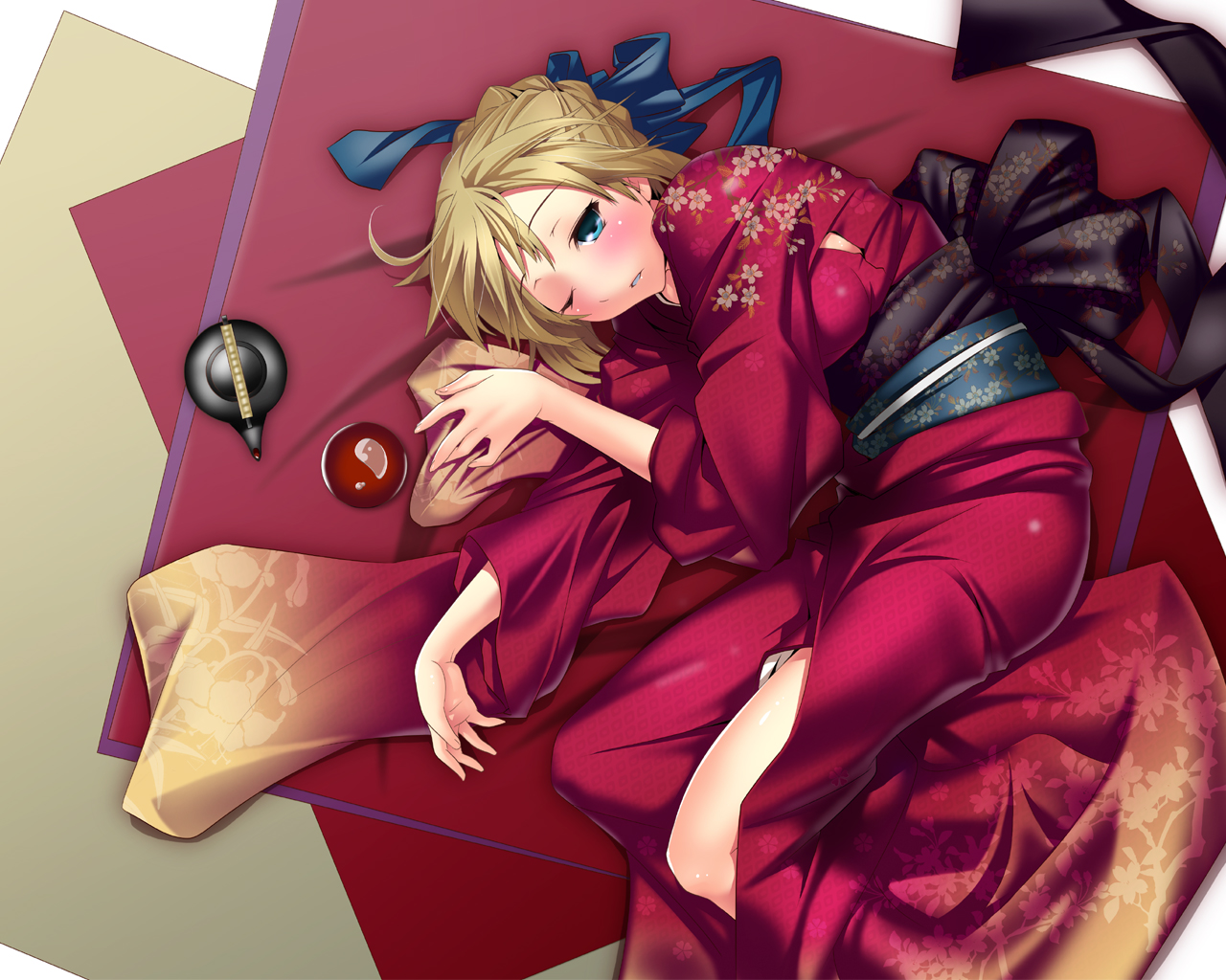 00s1girlalternate costumeblonde hairblue eyesblushfemale focusjapanese clotheskimonolyingon sideone eye closedsolowink