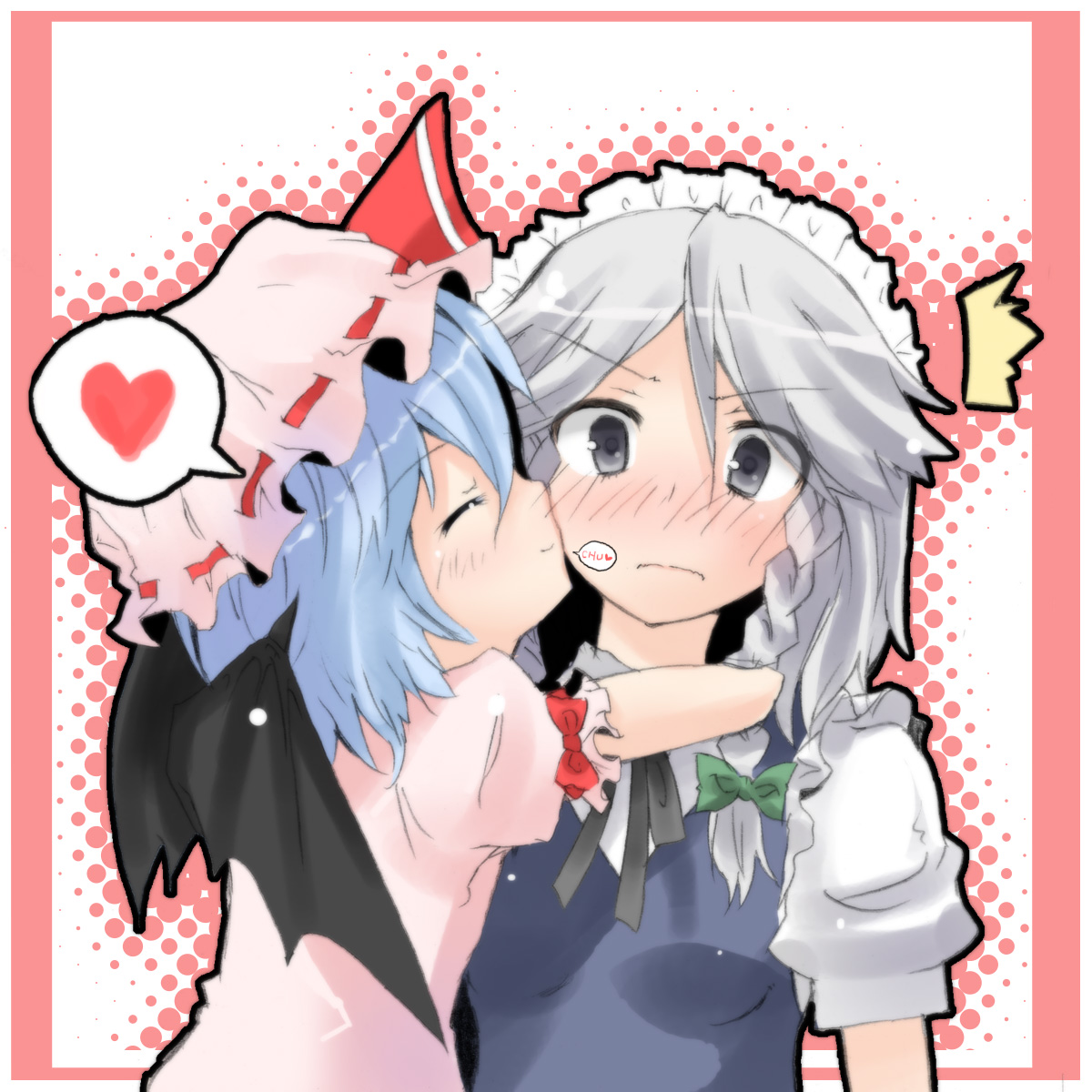1boy2girlsarms around neckbat wingsblue hairblushborderbraidbreastsclosed eyesembarrassedfacing viewerfemale focusgrey eyesgrey hairhathearthugkisskissing cheeklooking at viewermaid headdressmob capmultiple girlsoutlineromaji textshort hairshyside braidsmall breastssmilespoken heartsurprisedupper bodywhite borderwingsyuri