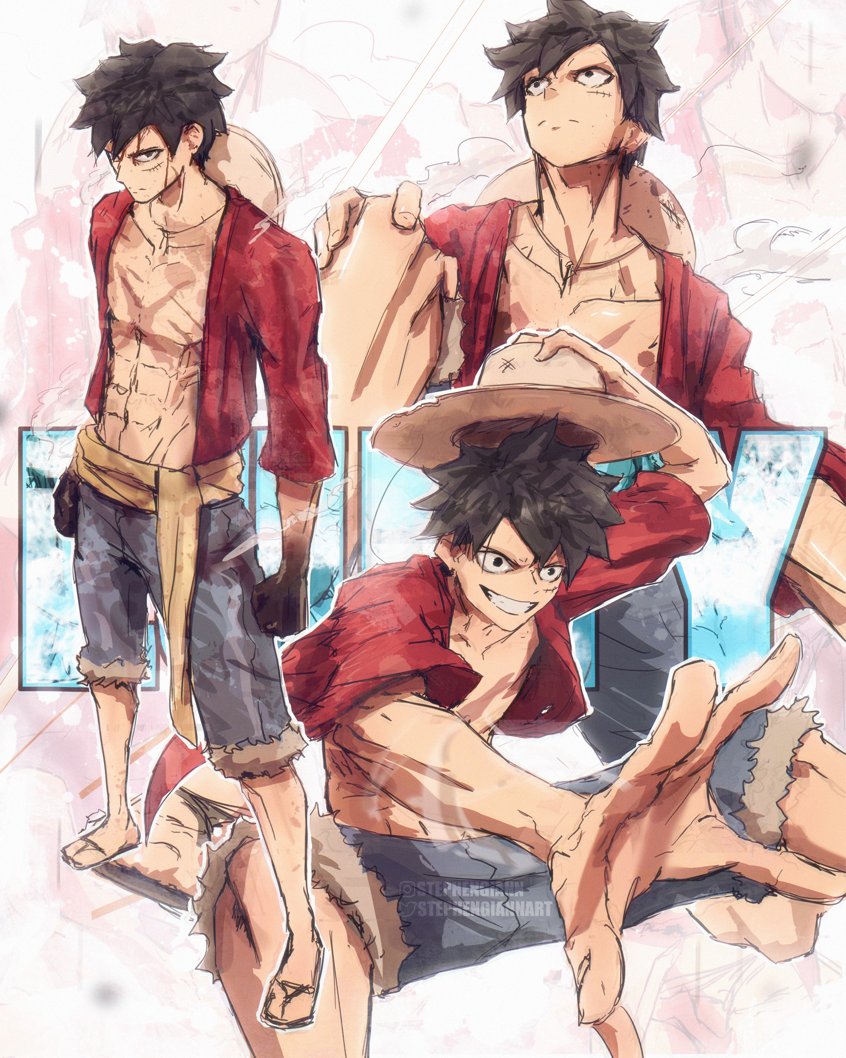 1boyabsblue shortsclenched teethfull bodyhaki (one piece)hatinstagram logoinstagram usernamemale focusmultiple viewsopen clothesopen shirtred shirtsandalssashscarscar across eyescar on faceshirtshortssmilestraw hatteethtwitter logotwitter usernameyellow sash