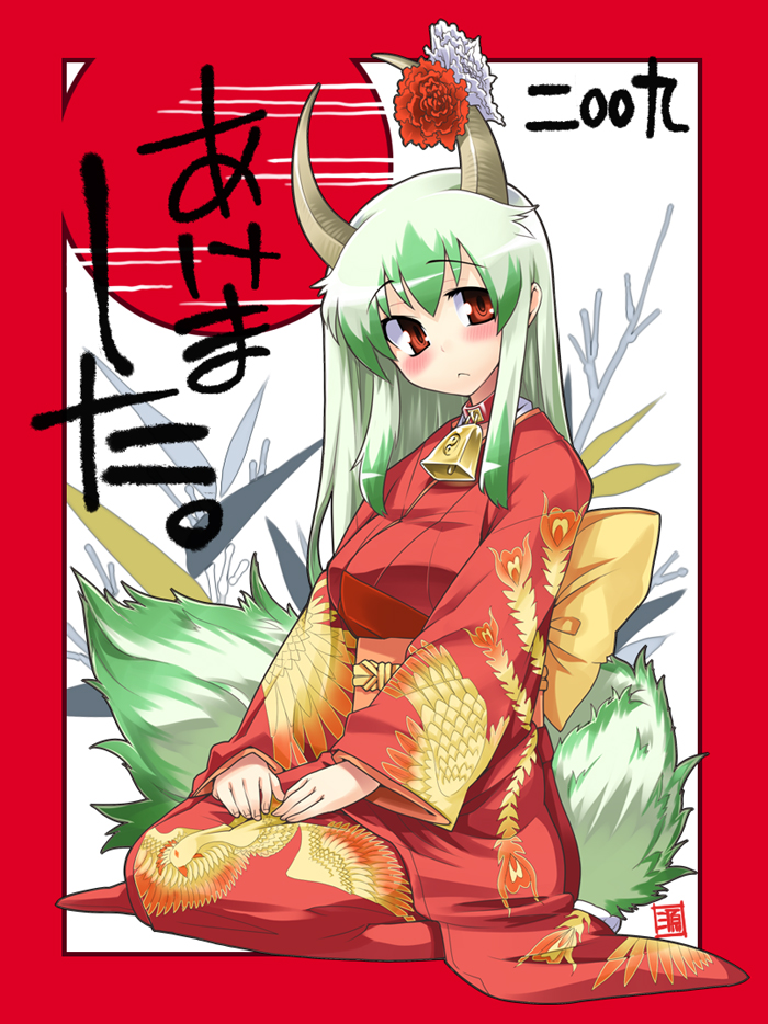 1girlbellblushcollarfemale focusfull bodygreen hairhornsjapanese clotheskimonokneelinglong hairneck bellnew yearorange eyessolotailwhite background