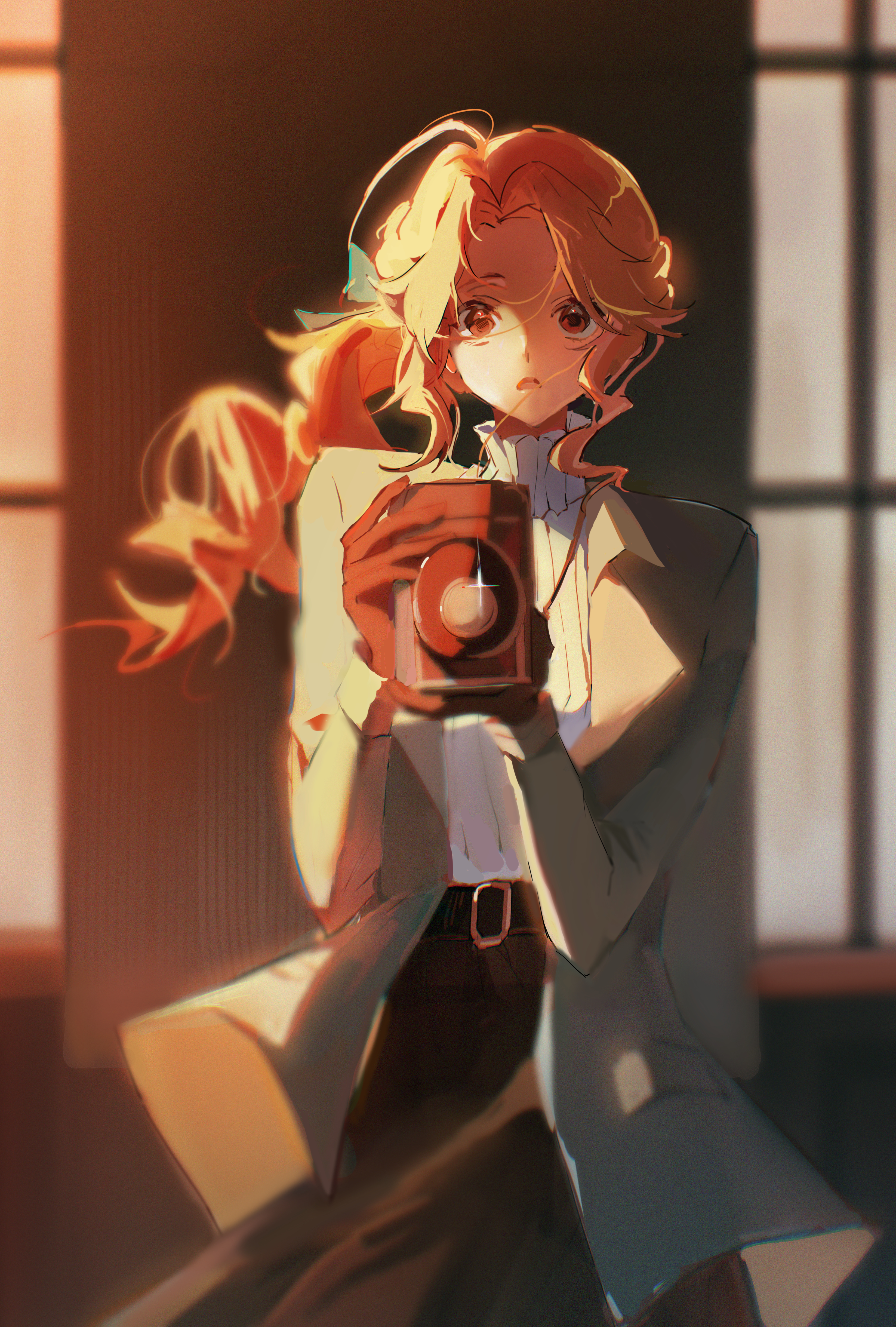 hama (22ji kara 24ji), original, 2girls, blue eyes, coat, glasses, multiple girls, orange hair, scarf, v, wink