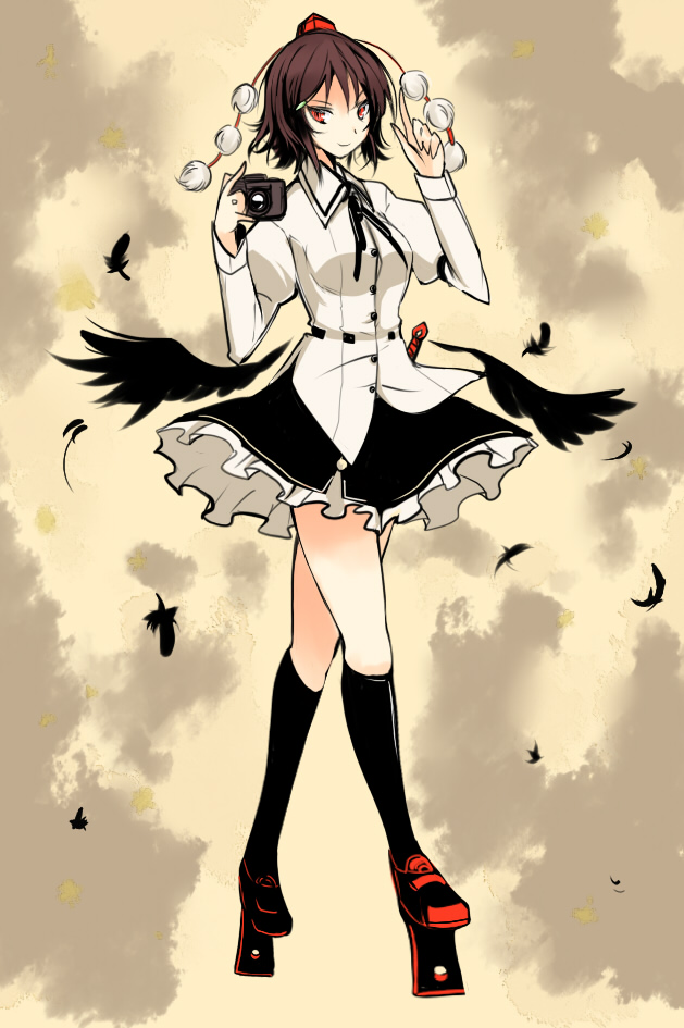 1girlblack hairblack wingsbrown haircamerafeathersfemale focusfull bodygetahatkneehighslooking at viewerred eyesshort hairsockssolotengu-getatokin hatwings