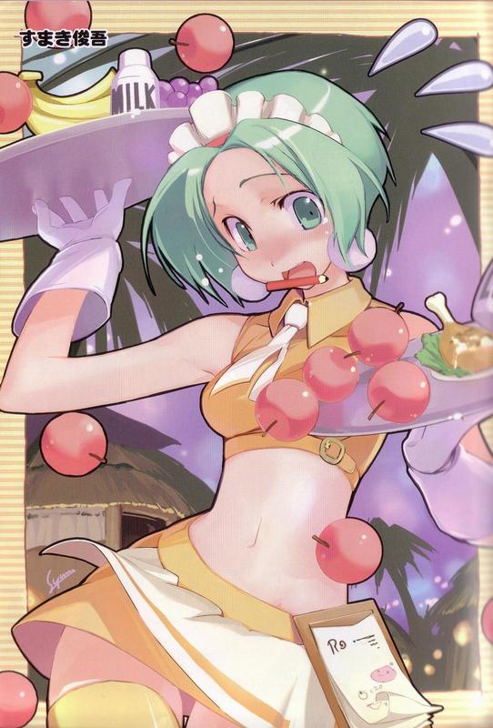 1girlappleapronbananablushfemale focusfoodfruitgrapesgreen eyesgreen hairkafra uniformmatching hair/eyesmidriffmilkplateshort hairsmilesolothighhighswaist apronwaitress