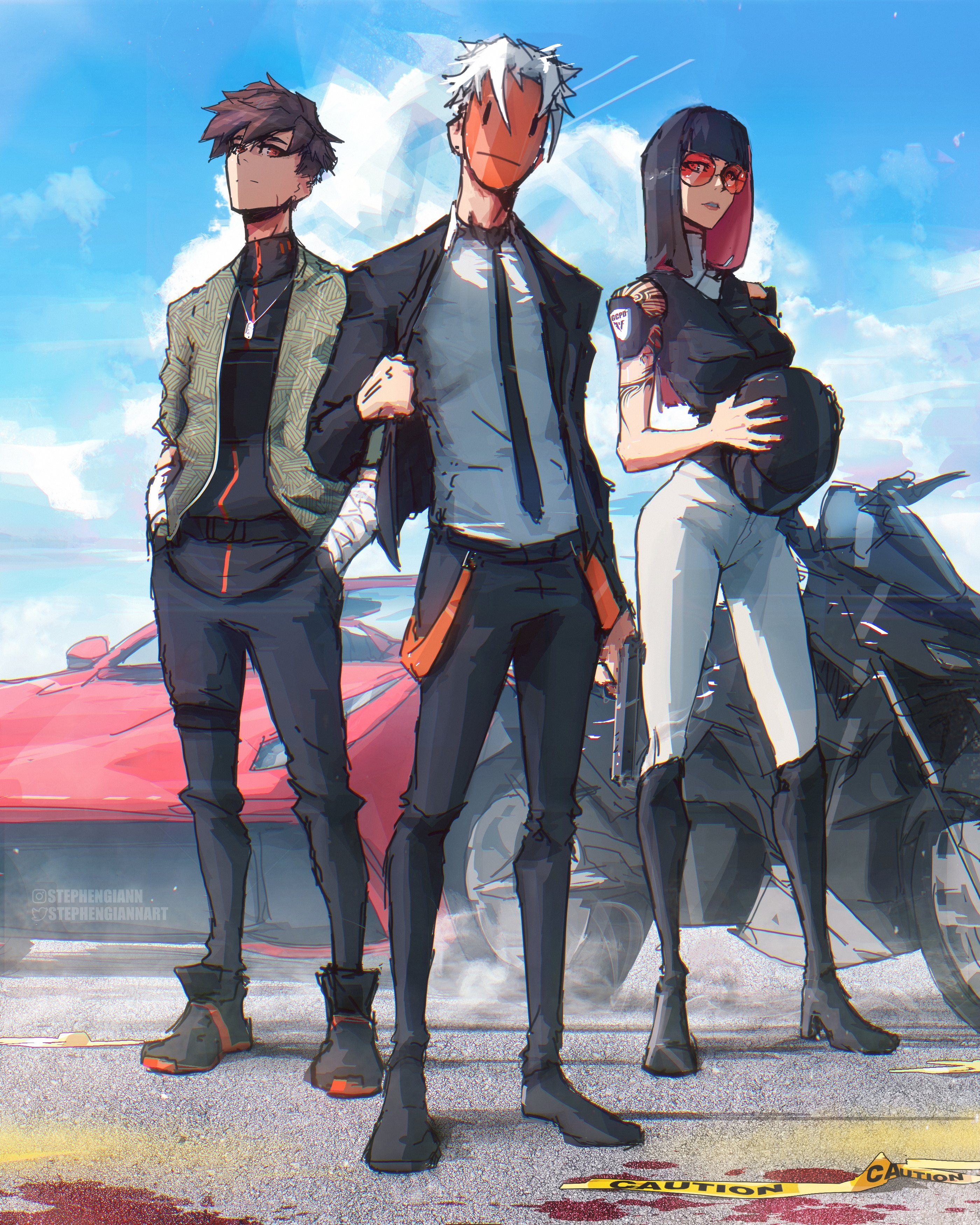 1girl2boysblack bootsblack hairblack suitblue skyblunt bangsbootscarchloe (stephengiannart)cloudformal clothesfull bodyhands in pocketshelmetholdingholding unworn helmetjacketjewelrymaskmotor vehiclemotorcyclemultiple boysnecklacepantsrage (stephengiannart)round eyewearshort hairskysuitthigh bootsunworn headwearunworn helmetwhite hairwhite pantsyuri (stephengiannart)