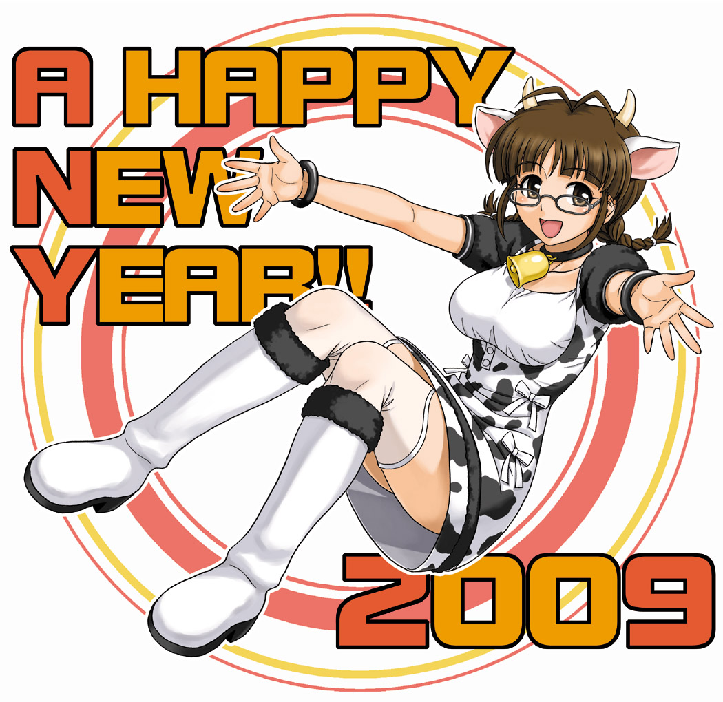 00s1girl2009animal earsanimal printantenna hairbellbootsbraceletbraidbreastsbrown eyesbrown haircollarcow earscow girlcow printcute & girly (idolmaster)dressfemale focusfull bodyglasseshappyhornsjewelrymonochrome spot (idolmaster)neck bellnew yearribbonsolothighhighstwin braidszettai ryouiki