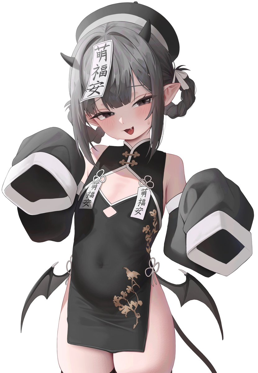 1girlarms upbat wingsberetblack dressblack eyesblack hairblack hatblack sleevesblushbraidbraided hair ringschina dresschinese clothescleavage cutoutclothing cutoutcowboy shotdemon girldemon hornsdemon wingsdetached sleevesdresshair intakeshair ringshalf-closed eyeshathead tilthornsimpossible clotheslooking at viewernavelofudaofuda on headopen mouthpaw posepointy earsshort hairsidelockssimple backgroundsleeves past fingerssleeves past wristssmilesolostomachsweatthighstwin braidswhite backgroundwings