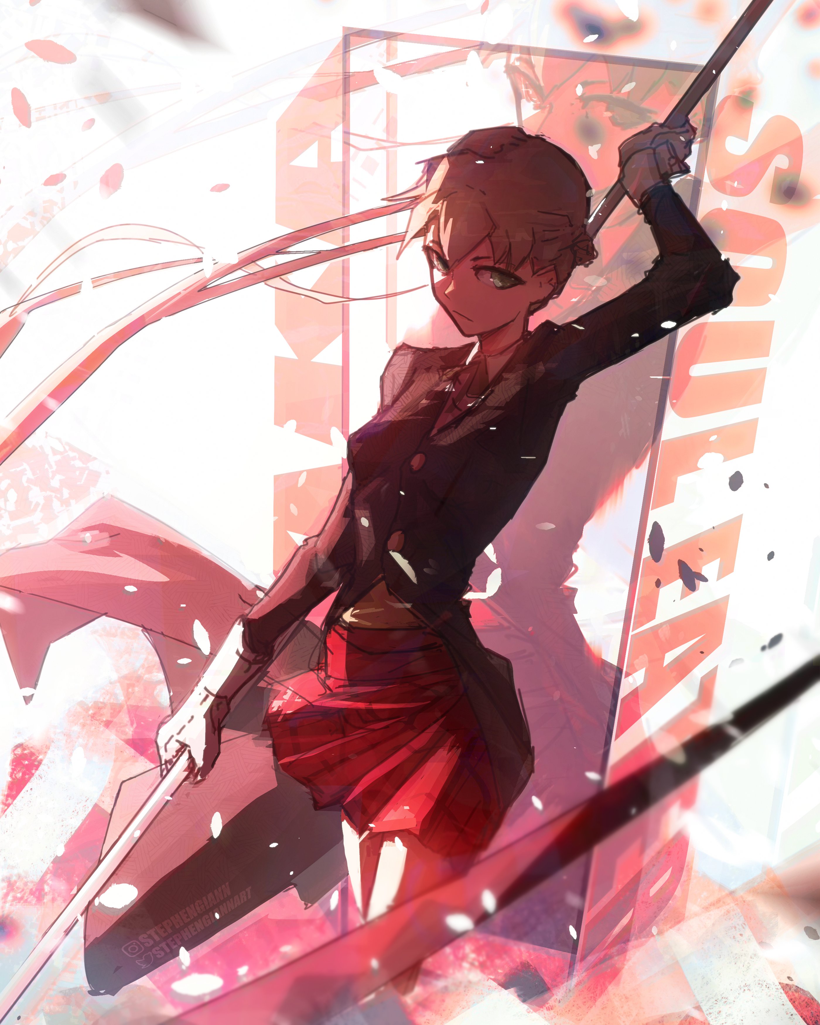 1girlblack coatblonde haircharacter nameclosed mouthcoatcopyright namecowboy shotfloating clothesglovesgreen eyesholdingholding scytheinstagram logoinstagram usernamemultiple viewsred skirtscytheskirttwintailstwitter logotwitter usernamewhite gloveswind
