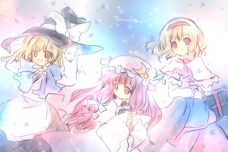 3girlsapronblonde hairbookbowbraidcapeletcrescent hat ornamentenglish textexpressionlessfemale focusfloating hairhair bowhairbandhands on headwearhathat ornamentholdingholding booklong hairmultiple girlspurple eyespurple hairribbonside braidsmilestar (symbol)witch hatyellow eyes