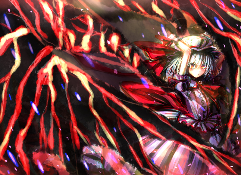 1girlblue hairblushdressfemale focushands on own headhathat ribbonopen mouthpuffy sleevesred eyesribbonshort hairsolowings