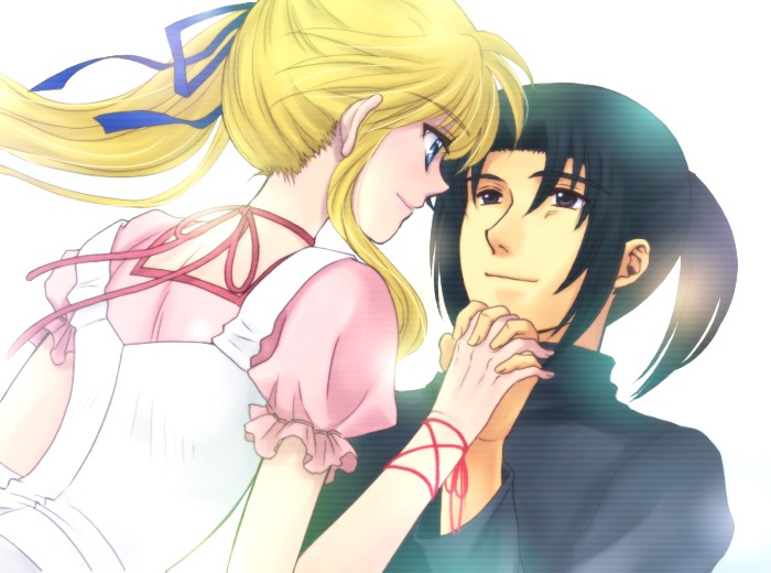 00s1boy1girlblack hairblonde hairblushcoupleheteroholdingholding handsinterlocked fingersponytailshort hairsimple backgroundsmileupper bodywhite background