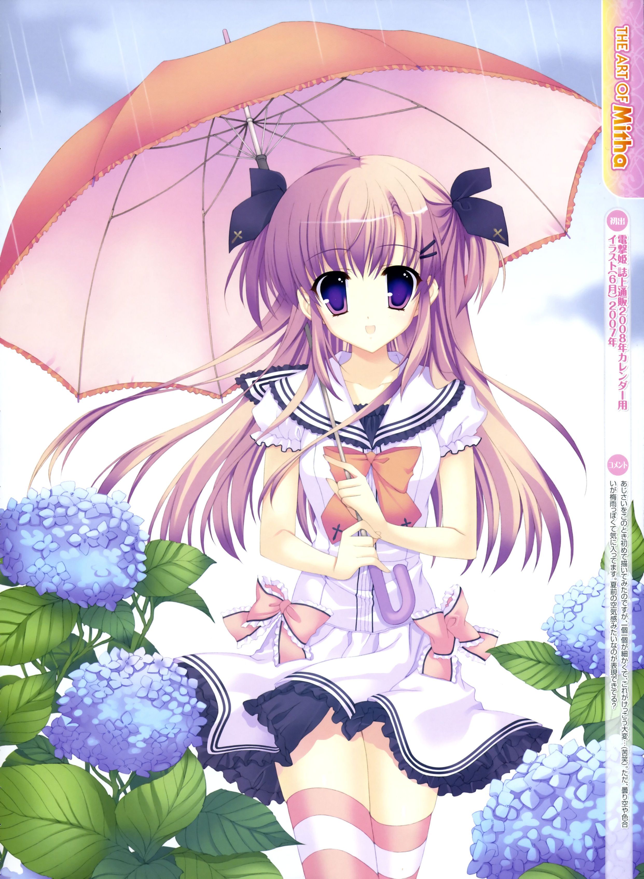 flowerhydrangealong hairpink hairpurple eyesrainschool uniformsolostriped clothesstriped thighhighsthighhighsumbrellazettai ryouiki