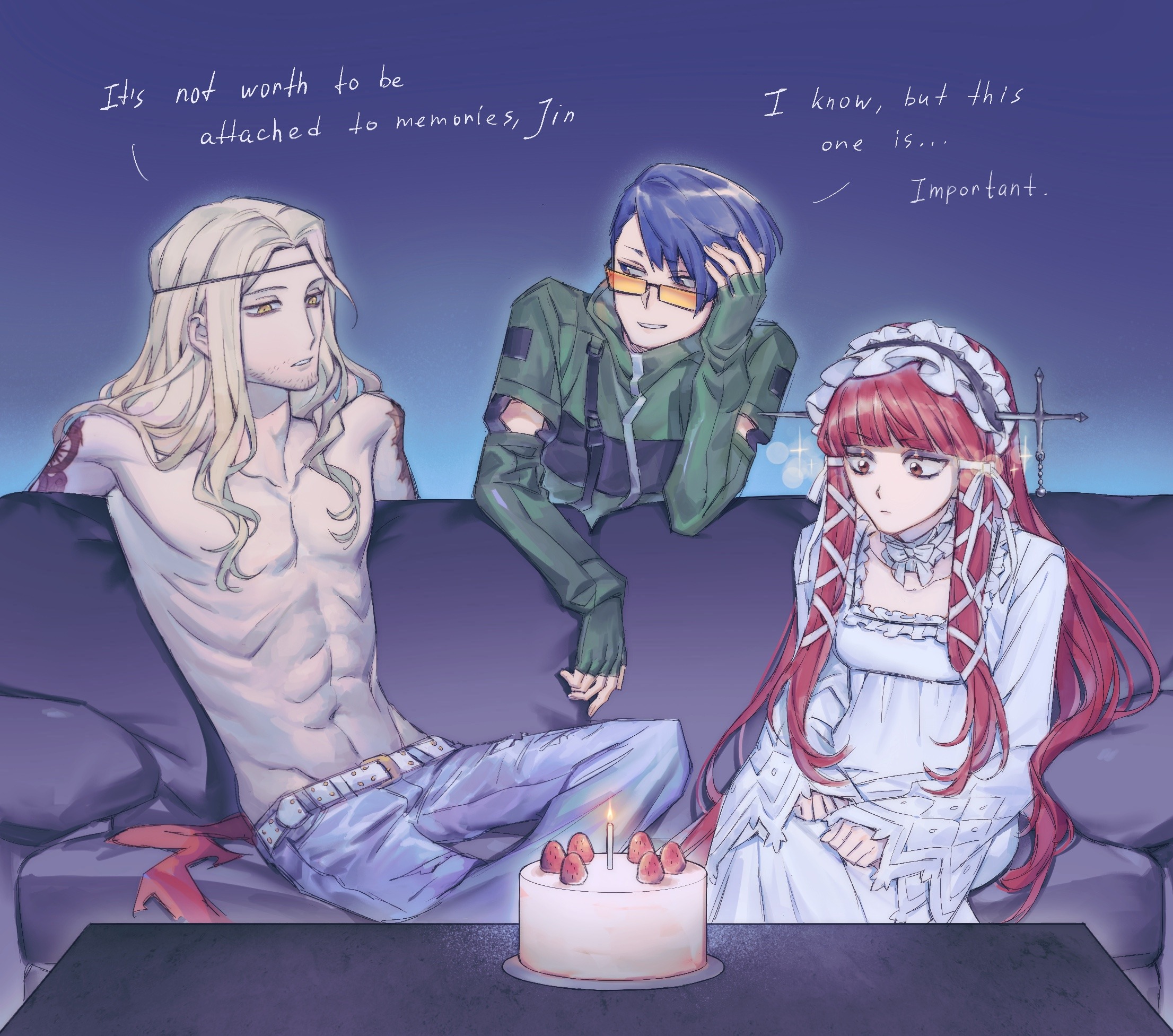 1girl2boysarm tattooarms behind couchbeard stubblebeltbirthday cakeblack-framed eyewearblue backgroundblue eyesblue hairblue pantsblunt bangsbreastsbrown eyescakecandleclosed mouthcollarcouchdenimdetached sleevesdressenglish textfacial hairfingerless glovesfoodfrilled collarfrilled hairbandfrillsfruitglassesglovesgreen jackethair ribbonhairbandhand on own headhands on lapjacketjeansleg over thighlolita fashionlolita hairbandlong hairlong sleeveslooking at anotherlooking at foodmultiple boysobject through headon couchorange-tinted eyewearpantsparted lipsrectangular eyewearred hairribbonsidelockssittingsmall breastssmilesparklestrawberrystubbletattootinted eyeweartkjnbrnrttopless maletress ribbonundercutwhite beltwhite collarwhite dresswhite hairwhite ribbonyellow eyes