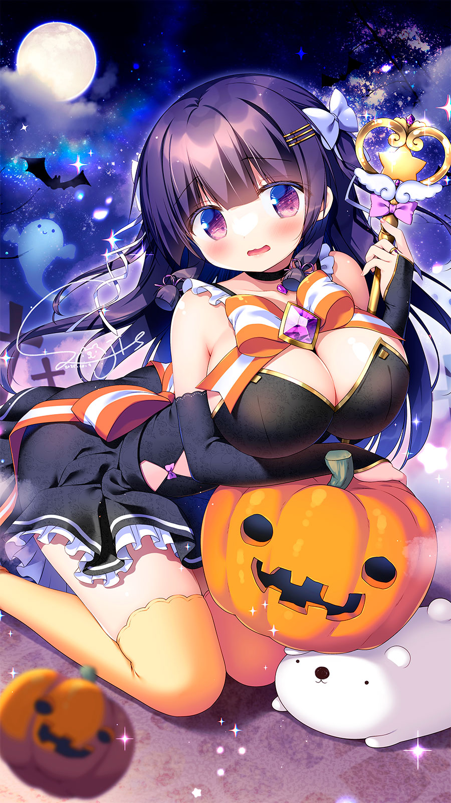 1girlbat (animal)black bridal gauntletsblack chokerblack dressblunt tressesblushbowbreastsbridal gauntletschokercleavagedressfull moongemghosthair bowholdingholding wandkneelinglarge breastslong hairlooking at viewermoonnightnight skyopen mouthorange boworange thighhighsoutdoorspumpkinpurple bowpurple eyespurple gemstonepurple hairskysleevelesssleeveless dresssolostriped bowthighhighsvery long hairwand
