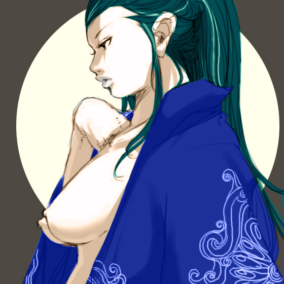 1girlbreastsbrown eyescleavagefemale focusgreen hairjapanese clotheslarge breastslipslong hairmonochromenipplesopen clothesopen shirtshirtsolo