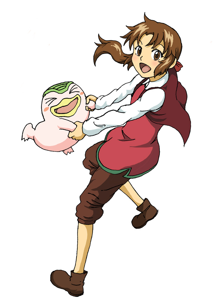 1990s (style)1boy1girlblush stickersbootsbrown eyesbrown hairclosed eyescolored skinfull bodyhair ribbonhappyholding handslaughinglong hairlooking at vieweropen mouthpink skinplayingponytailretro artstyleribbonsimple backgroundsmilevestwhite background