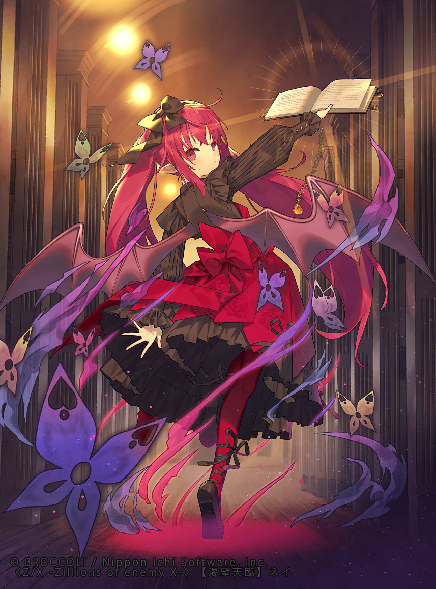1girlblack bowblack dressblack shoesbookbowbugbutterflyclosed mouthcopyright noticedemon wingsdressglowing butterflyhair bowholdingholding bookindoorsinsectlong hairlooking backmulticolored dressnei (z/x)open bookpantyhosepointy earsred dressred eyesred hairred pantyhoseshoessolostandingstanding on one legtwintailswings
