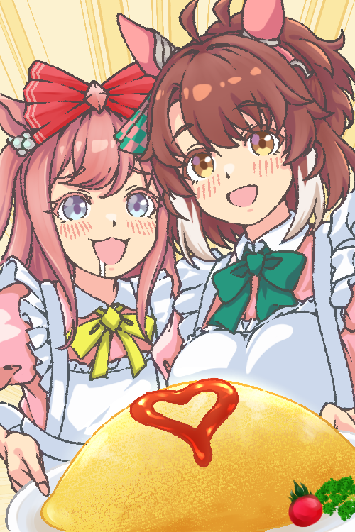2girlsahogeanimal earsapronblue eyesblushbowbreastsbrown eyesbrown haircheckered ribbondressdroolingear coversear ornamentear ribbonfoodgreen bowhair between eyeshair bowhair ornamentholdingholding platehorse earshorse girlketchuplarge breastslong hairlooking at viewermaid apronmulticolored hairmultiple girlsomeletomuriceopen mouthpink dresspink hairplatesalivasmilewhite apronwhite hairyellow bow