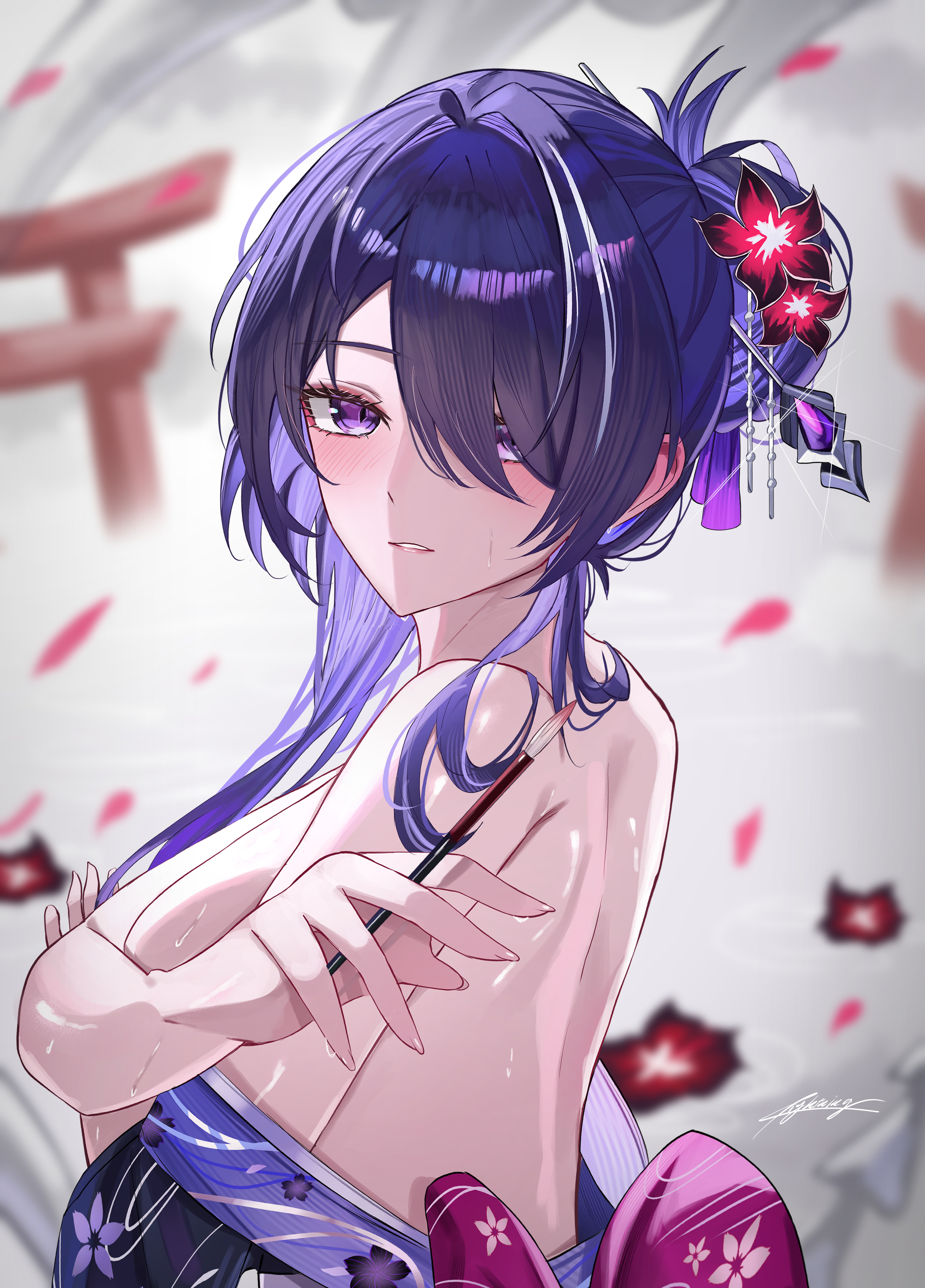 1girlblurryblurry backgroundblushbreastsclothes downfingernailsflowerfrom sidehair flowerhair ornamenthair stickholdingholding paintbrushlarge breastslong hairlooking at viewerlooking to the sidemulticolored hairpaintbrushparted lipspurple eyespurple hairred flowerred petalssignaturesolostreaked hairsweattorii