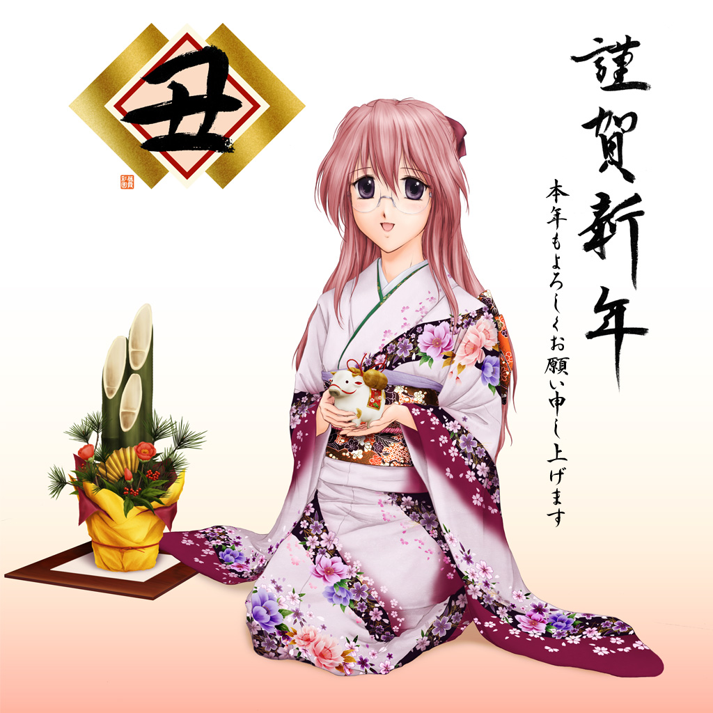 00s1girlfemale focusfloral printglasseshappy new yearjapanese clotheskadomatsukimonolong hairnew yearopen mouthpink hairpurple eyesseizasittingsolo