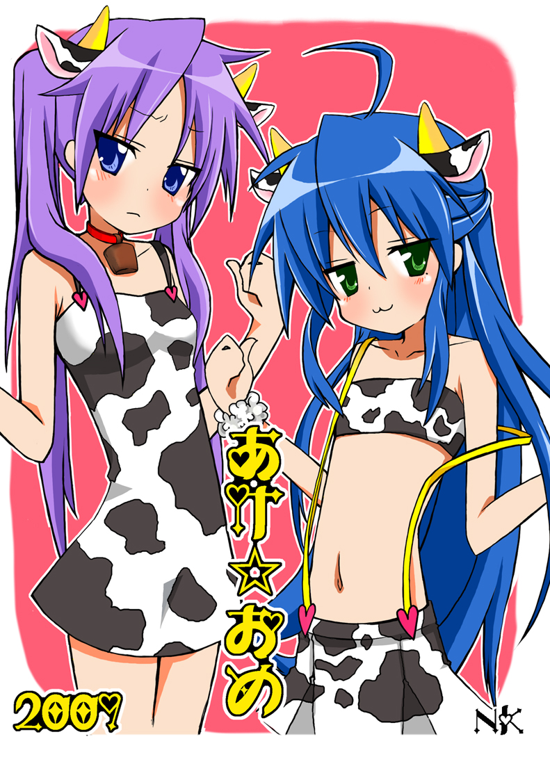 :300s20092girlsahogeanimal earsanimal printbandeaubellblue eyesblue haircow earscow printcowbelldressflat chestgreen eyeshornslong hairmidriffmolemole under eyemultiple girlsnew yearpurple hairskirtstraplesssuspenderstube toptwintails