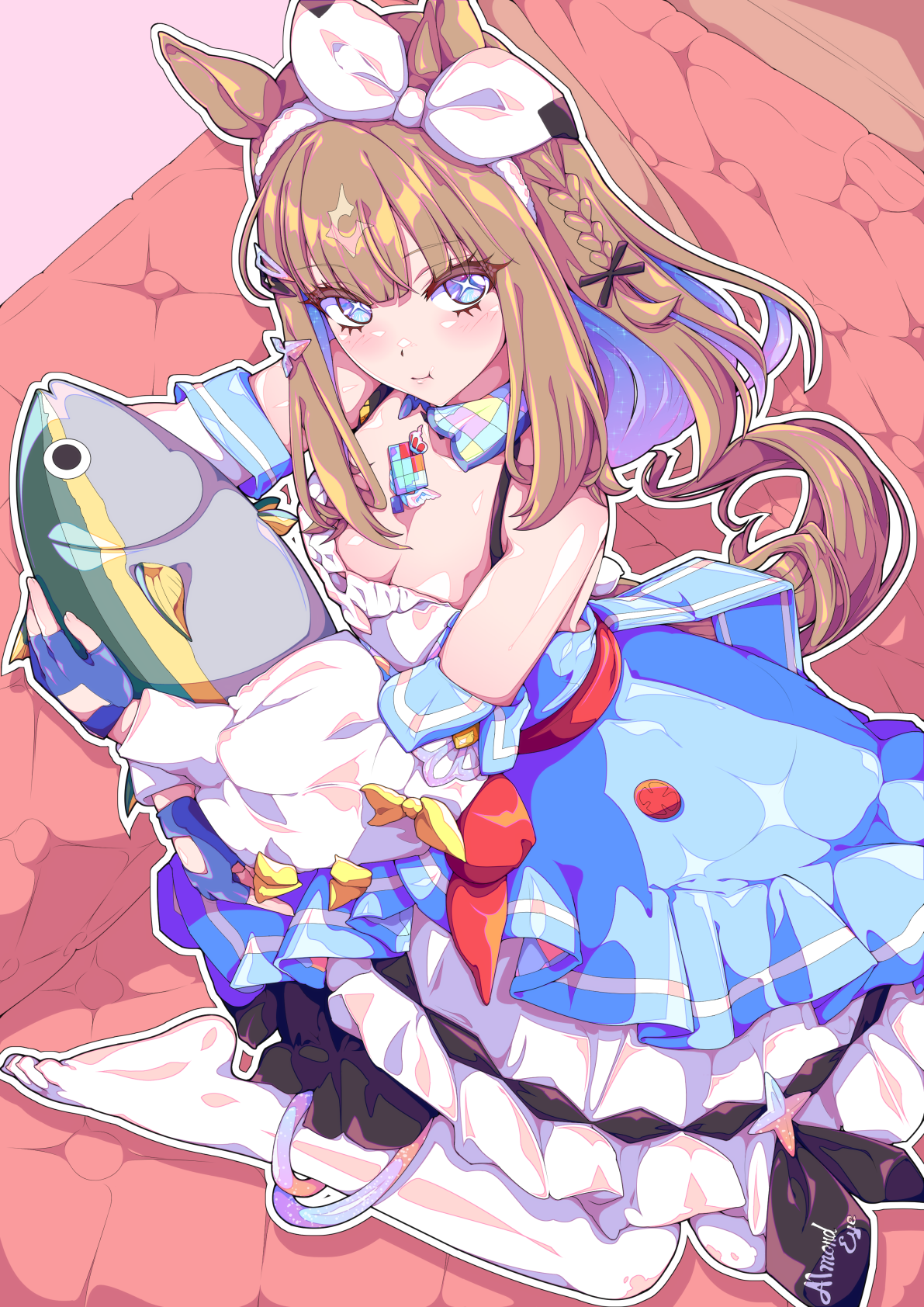 1boy1girlanimalanimal earsbare shouldersblue dressblue eyesblue glovesblushbow hairbandbraidbraided sidelocksbreastsbrown haircleavageclosed mouthcolored inner hairdetached collardetached sleevesdressfingerless glovesfishgloveshair between eyeshair ornamenthairbandhairclipholdingholding animalholding fishhorse earshorse girlhorse taillong hairlooking at viewermedium breastsmulticolored hairpoutsolosymbol-shaped pupilstailwhite hairbandx-shaped pupils
