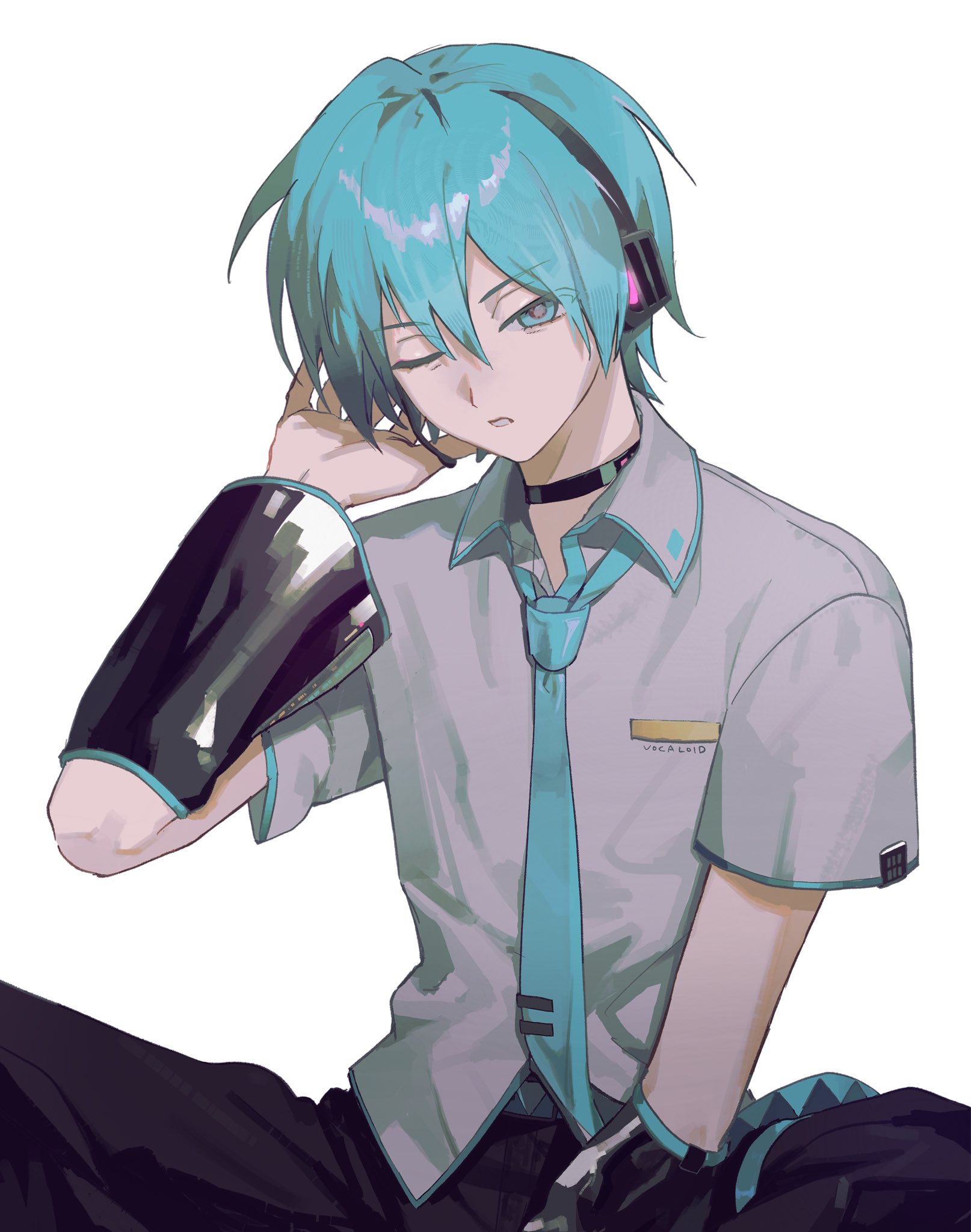 1boyblack chokerblack pantsblue eyesblue hairblue necktiechokercollared shirtgrey shirtlooking at viewermale focusnecktieone eye closedpantsshirtshort hairshort sleevessimple backgroundsolowhite background