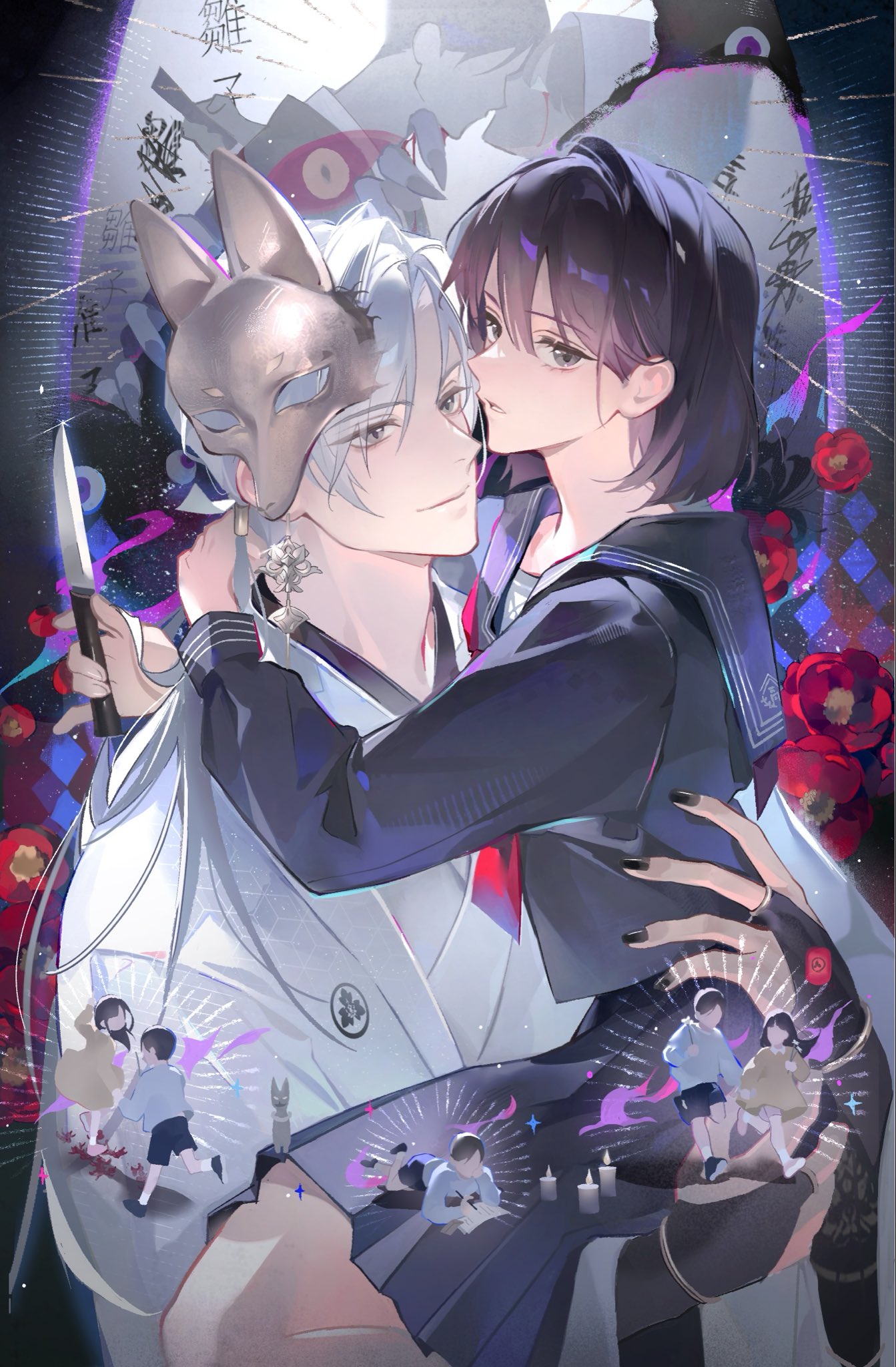 1boy1girlblack hairblack serafukubridal gauntletscarryingcarrying personearringsfox maskgrey eyesheteroholdingholding knifejapanese clothesjewelrykimonoknifelong hairlooking at viewerlow ponytailmasknail polishponytailschool uniformserafukushort hairsingle earringsmilewhite hairwhite kimono
